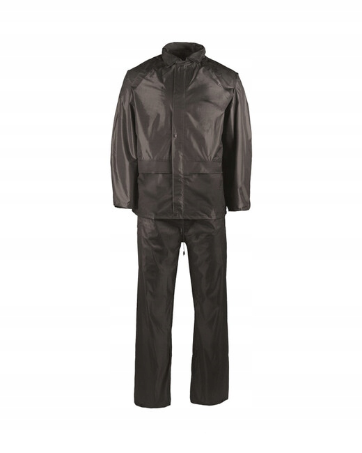 100% polyester, coated with polyvinyl chloride weight: 200 g/QM water pole: 3,000 mm - a very light suit for wet weather of small size (including bag) - jacket with a zipper from the front and an integrated hood in the collar - 2 pocket - with string and stopper - wide legs with 2 pockets - belt with elastic - leg cuffs fastened with latches