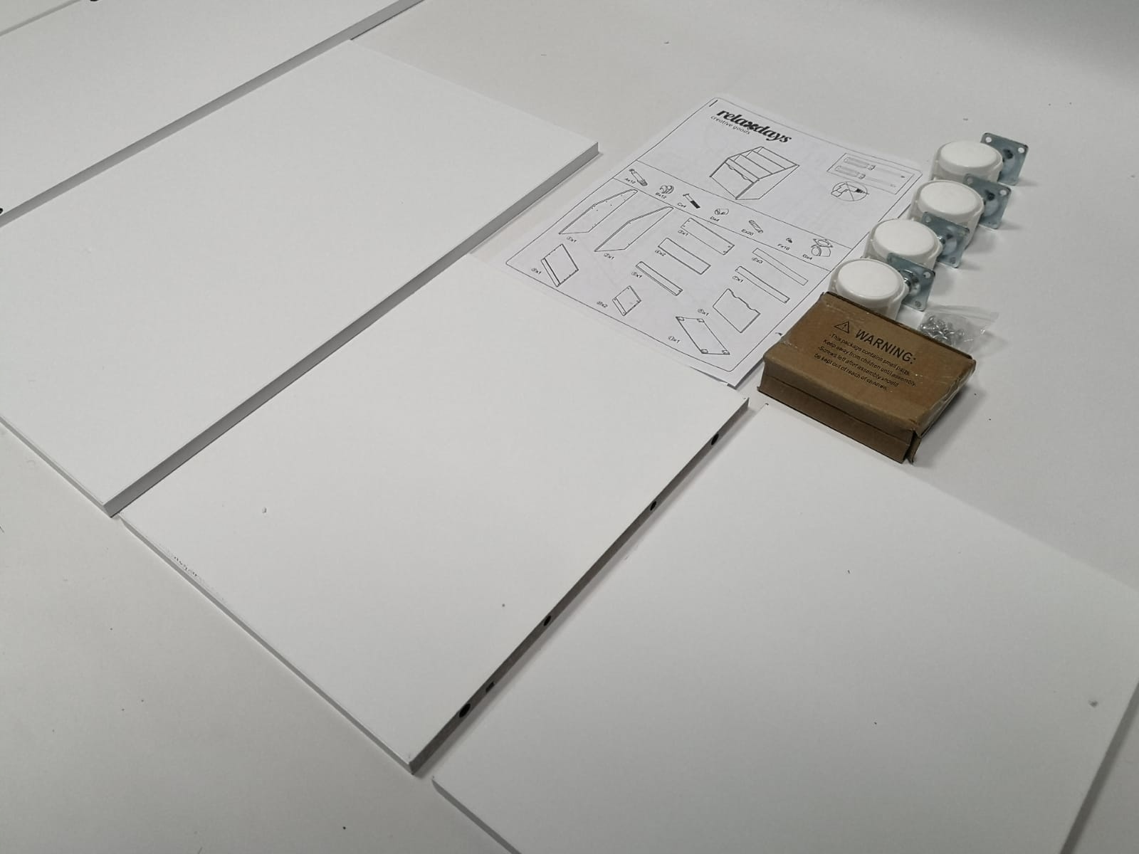 - з 3 відкритими відділеннями та ящиком для іграшок на колесах