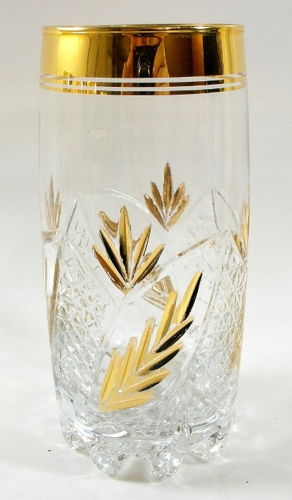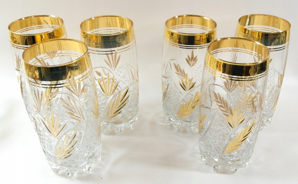 Красиві, старі, масивні келихи - набір 6 шт., з товстого безбарвного кришталевого скла, глибокий, позолочений малюнок..