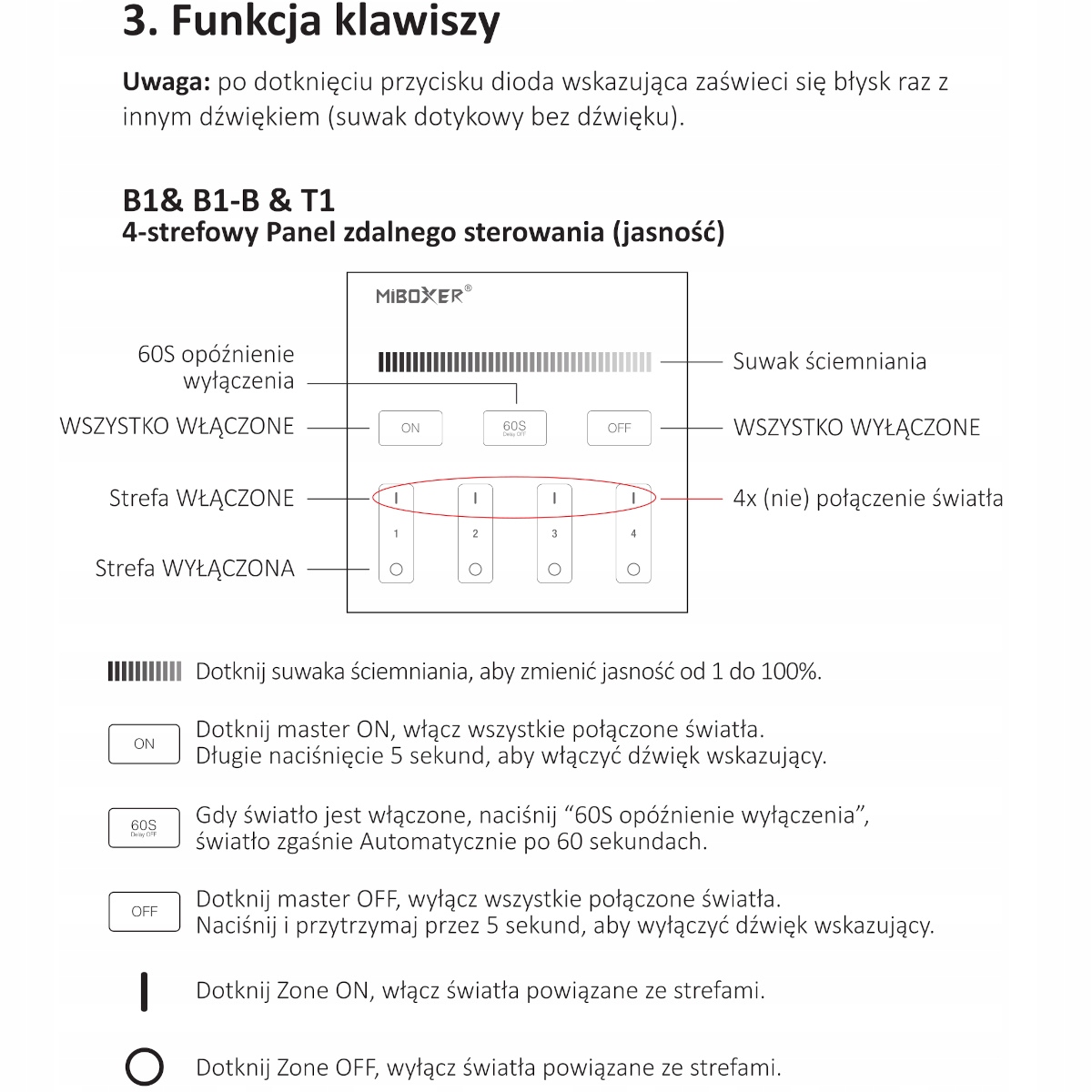 4-х зонний радіопульт Miboxer MiLight B1B чорного кольору, призначений для керування монозонними контролерами Miboxer MiLight FUT036. Завдяки перерахованим вище драйверам і пульту дистанційного керування можна легко створити систему зонального контролю для одноколірних світлодіодних стрічок. Пульт дистанційного керування живиться від двох батарейок ААА, і його можна розмістити будь-де, наприклад, на стіні. Перед першим використанням ви повинні сполучити пульт дистанційного керування з контролерами відповідно до інструкцій. На одну зону можна призначити необмежену кількість контролерів.