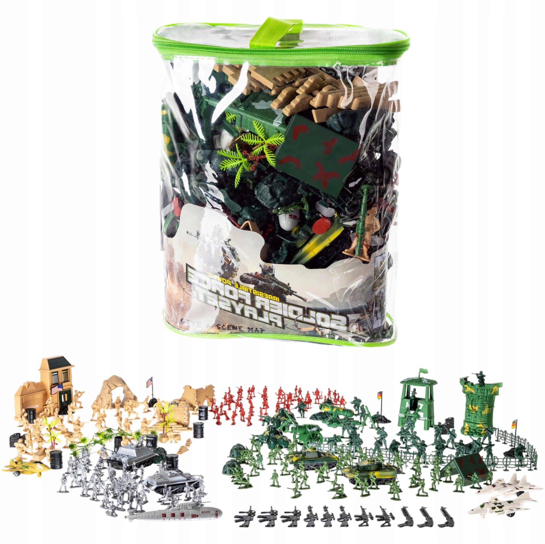 - НАБІР СОЛДАТІВ XXL - Цей унікальний набір неодмінно сподобається кожному маленькому військовому ентузіасту. У набір входять: солдати, зброя, танки, літаки, підводний човен, гармати, будівлі, паркани, дерева та багато інших аксесуарів. Це дозволить тобі годинами розважатися наодинці, з однолітками та з родиною. Це ідеальний спосіб позбутися від нудьги в холодні чи дощові дні.
