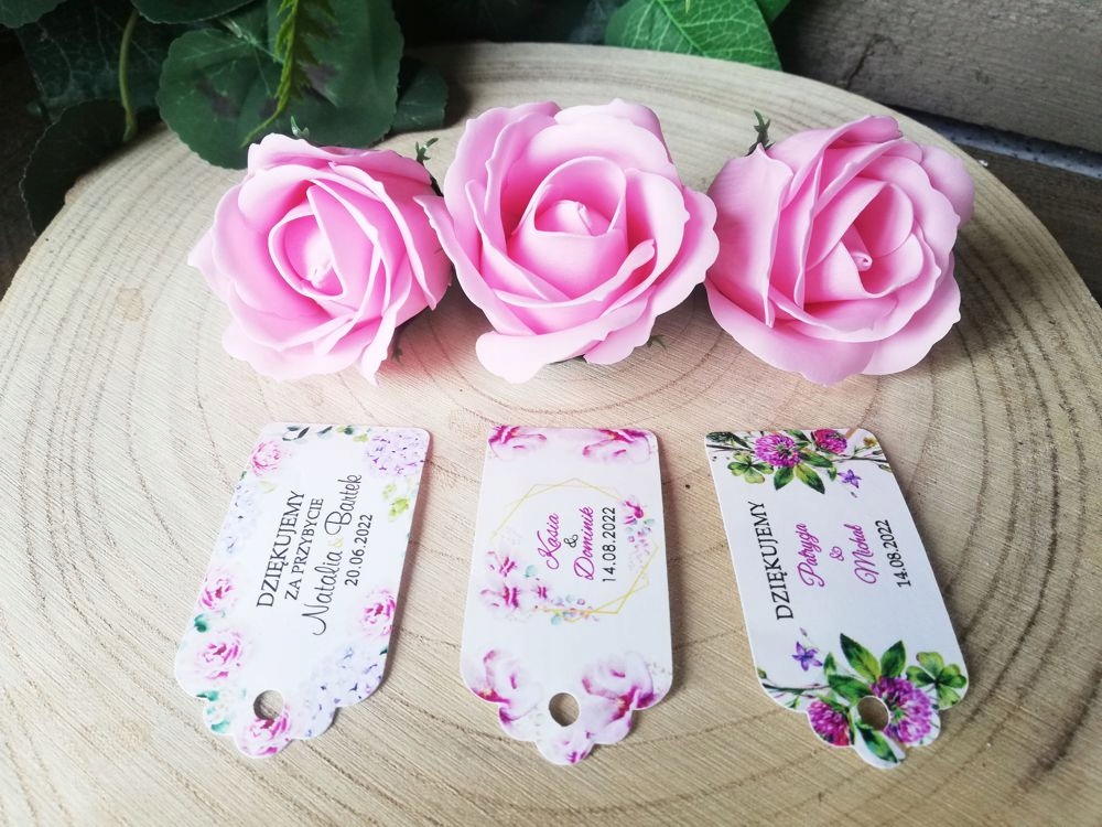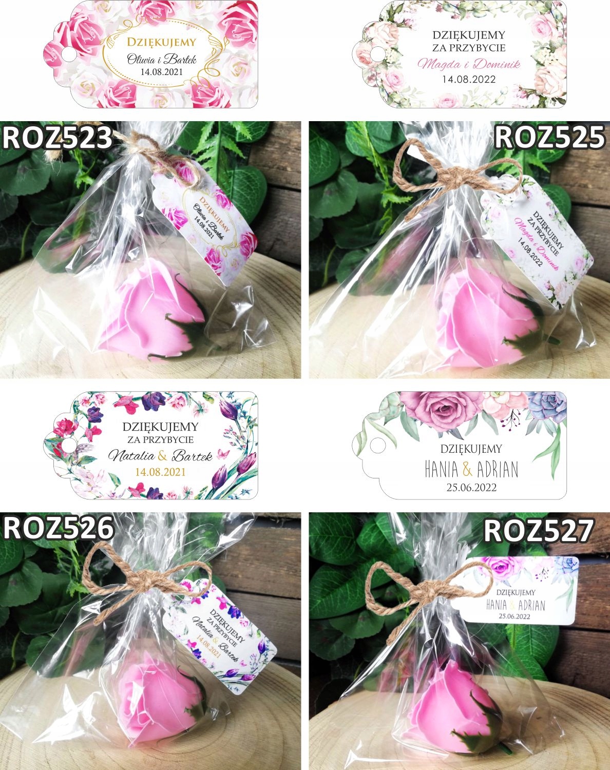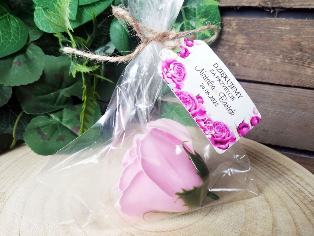 Наші мильні троянди - це оригінальний подарунок, подарунок для весільних гостей. Окрім Soap Rose, набір включає персоналізовану підвіску та мішок з целофаном з прикріпленою джутовою струною для незалежної краватки. Целофан
