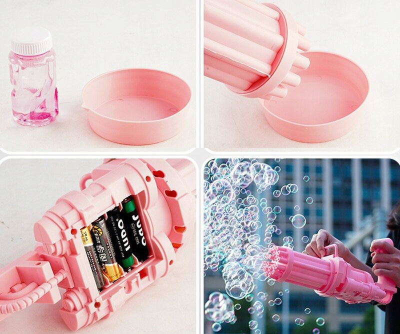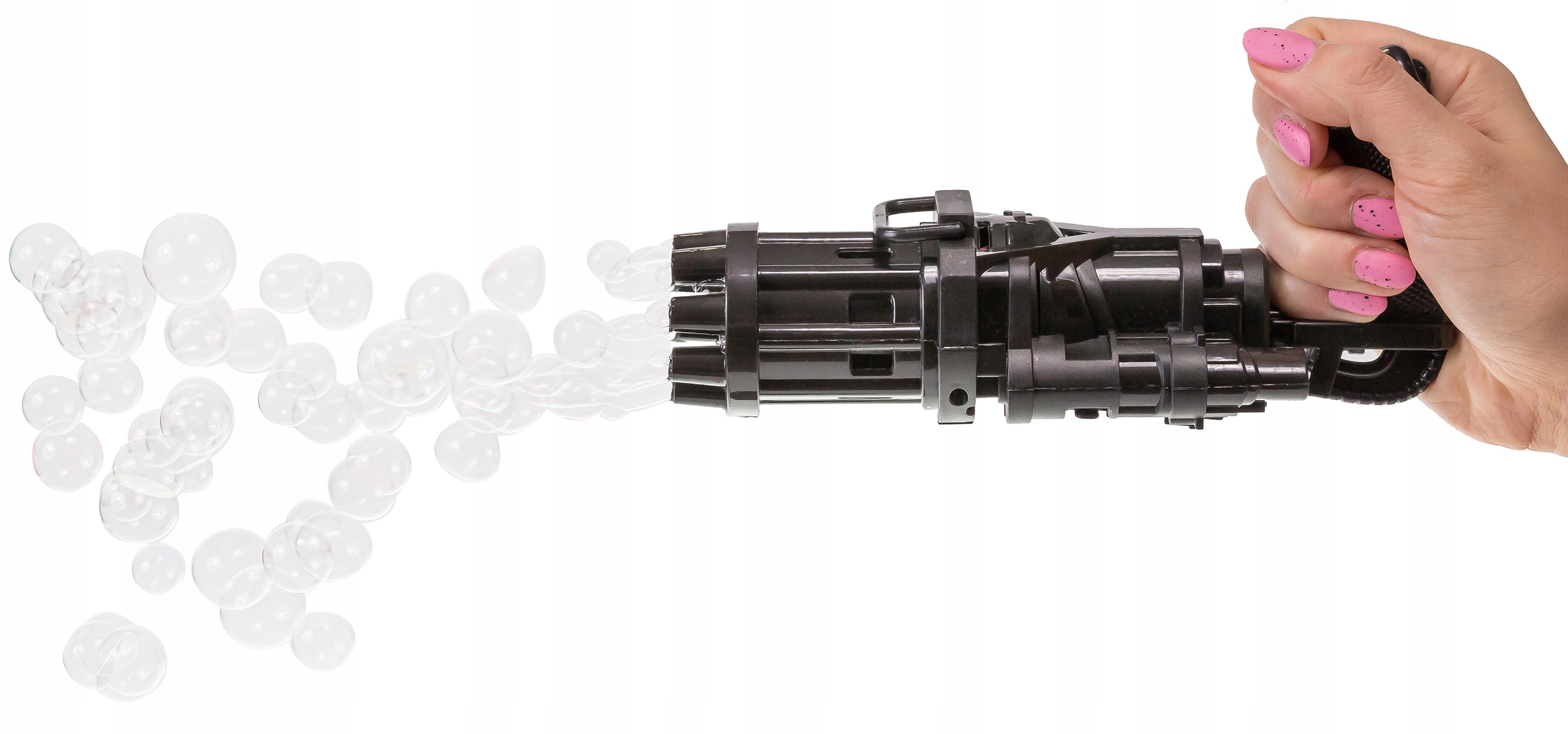 Кулемет має 8 отворів для бульбашок, які можуть видувати сотні бульбашок за хвилину. Цю машину для бульбашок можна використовувати як літній вентилятор зі знятою головкою для бульбашок, коли ви відчуваєте втому після погоні