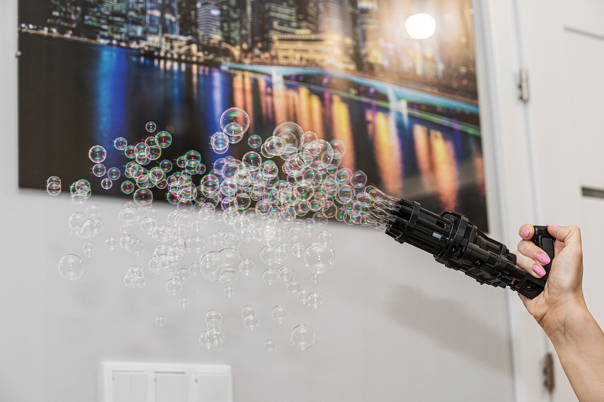 Просто поставте пістолет на підставку, потім натисніть на спусковий гачок пістолета, і ви отримаєте магію сотень мильних бульбашок.