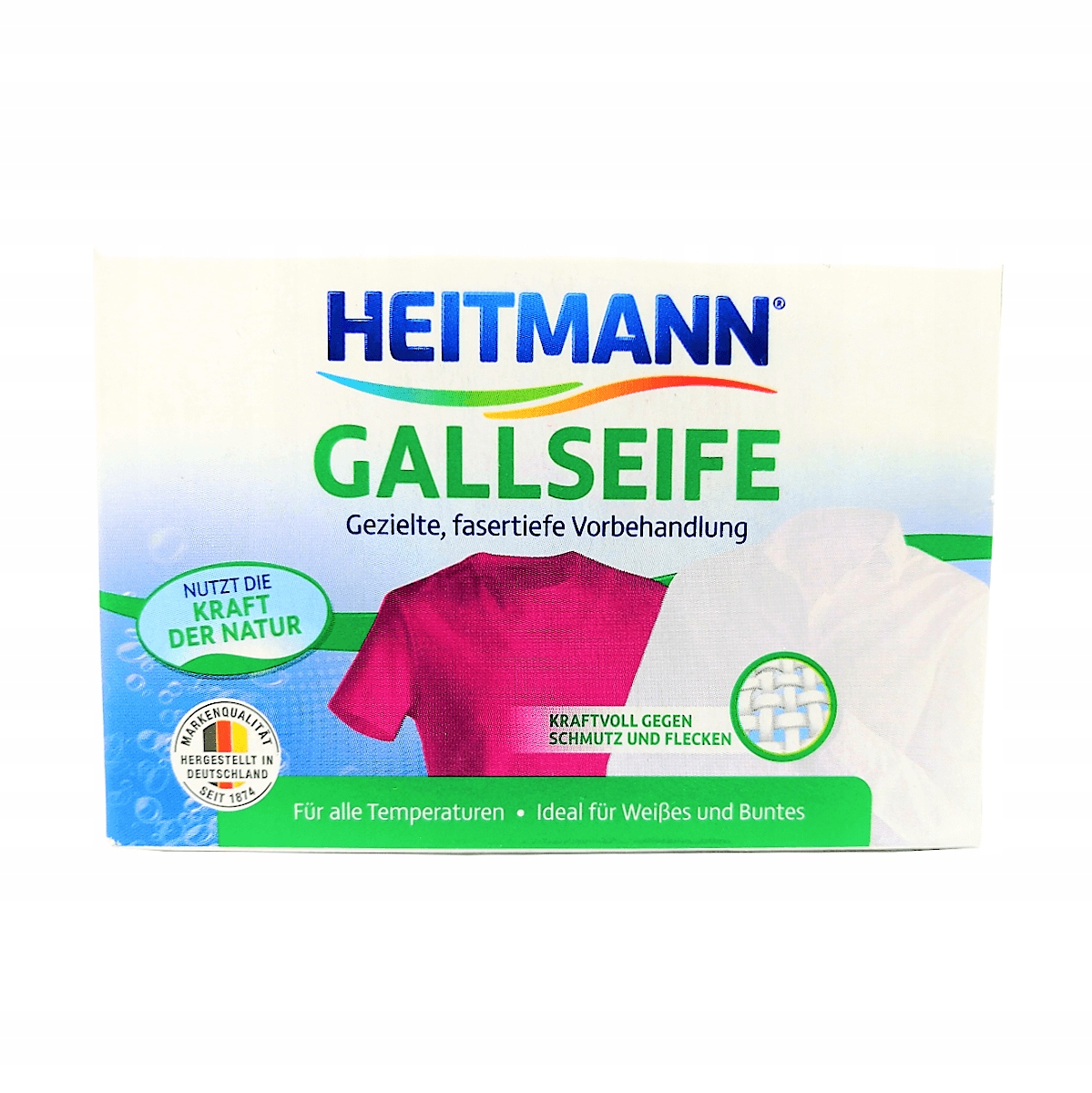 Heitmann Gallseife — німецьке мило для виведення плям. Німецький засіб для виведення плям, який використовується роками. Німецьке мило - це екологічний засіб для плям від плям різних типів тканин. Підходить не тільки для одягу, але і для килимів, оббивки автомобіля і домашніх диванів. Перед використанням ретельно змочіть мило та тканину, на якій є плями. На наступному кроці натріть пляму милом, зачекайте, поки воно подіяє, а потім виперіть.