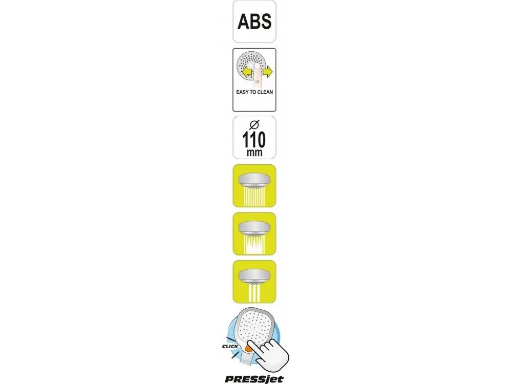 Функціональний перемикач PRESSjet , розташований у ергономічній точці душової лійки, означає, що вам більше не потрібно використовувати другу руку для швидкої та ефективної зміни типу струменю.