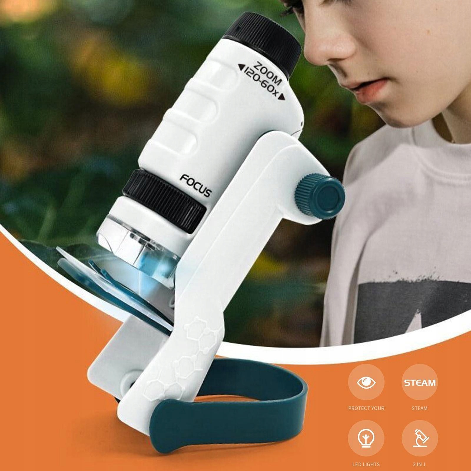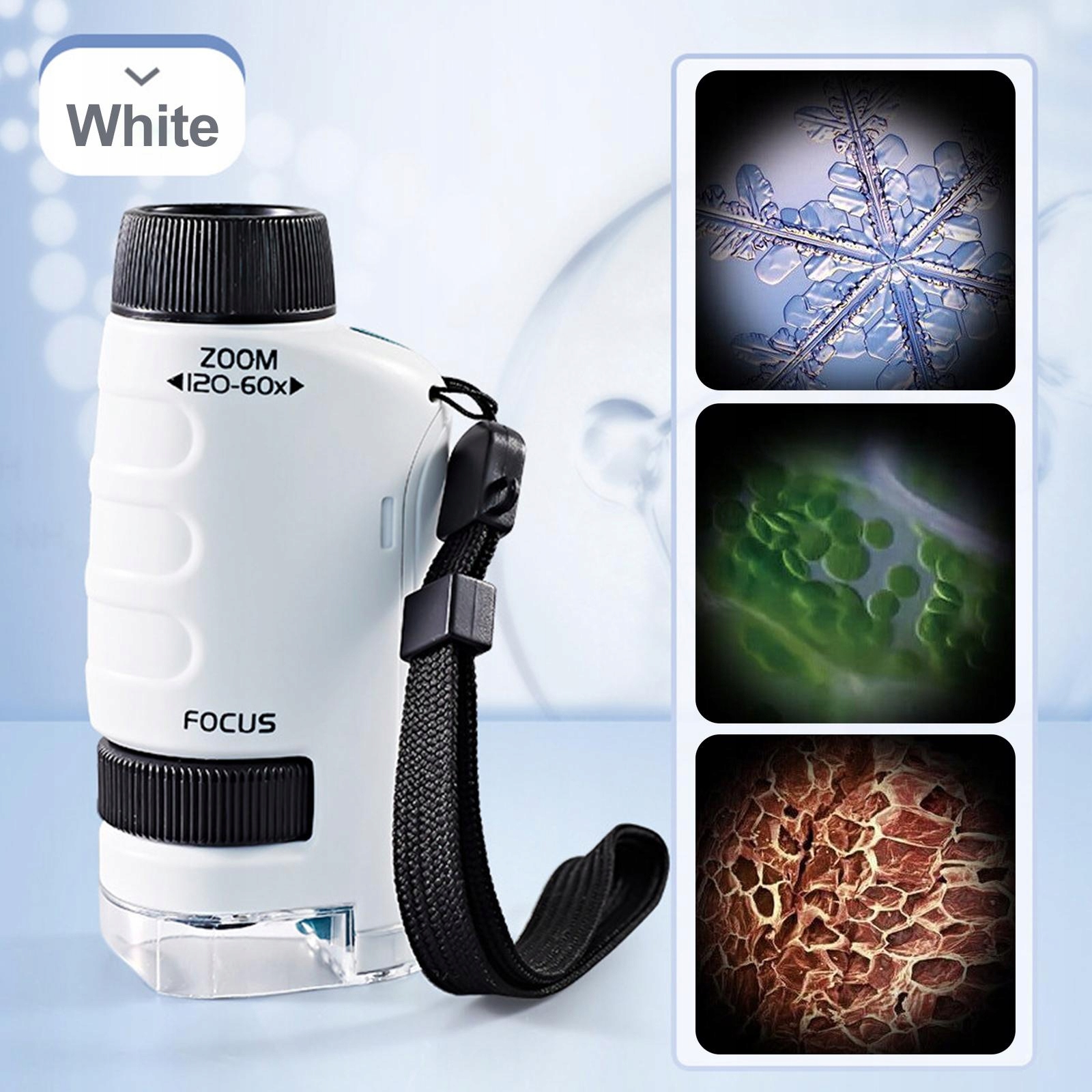 Ручний: ручний дитячий кишеньковий мікроскоп 60X-120X зі світлодіодним підсвічуванням. кишеня. Легкий шнурок. Живлення від 1 батареї AAA (не входить у комплект).