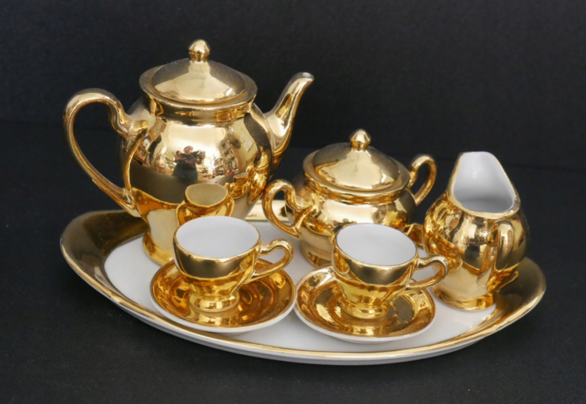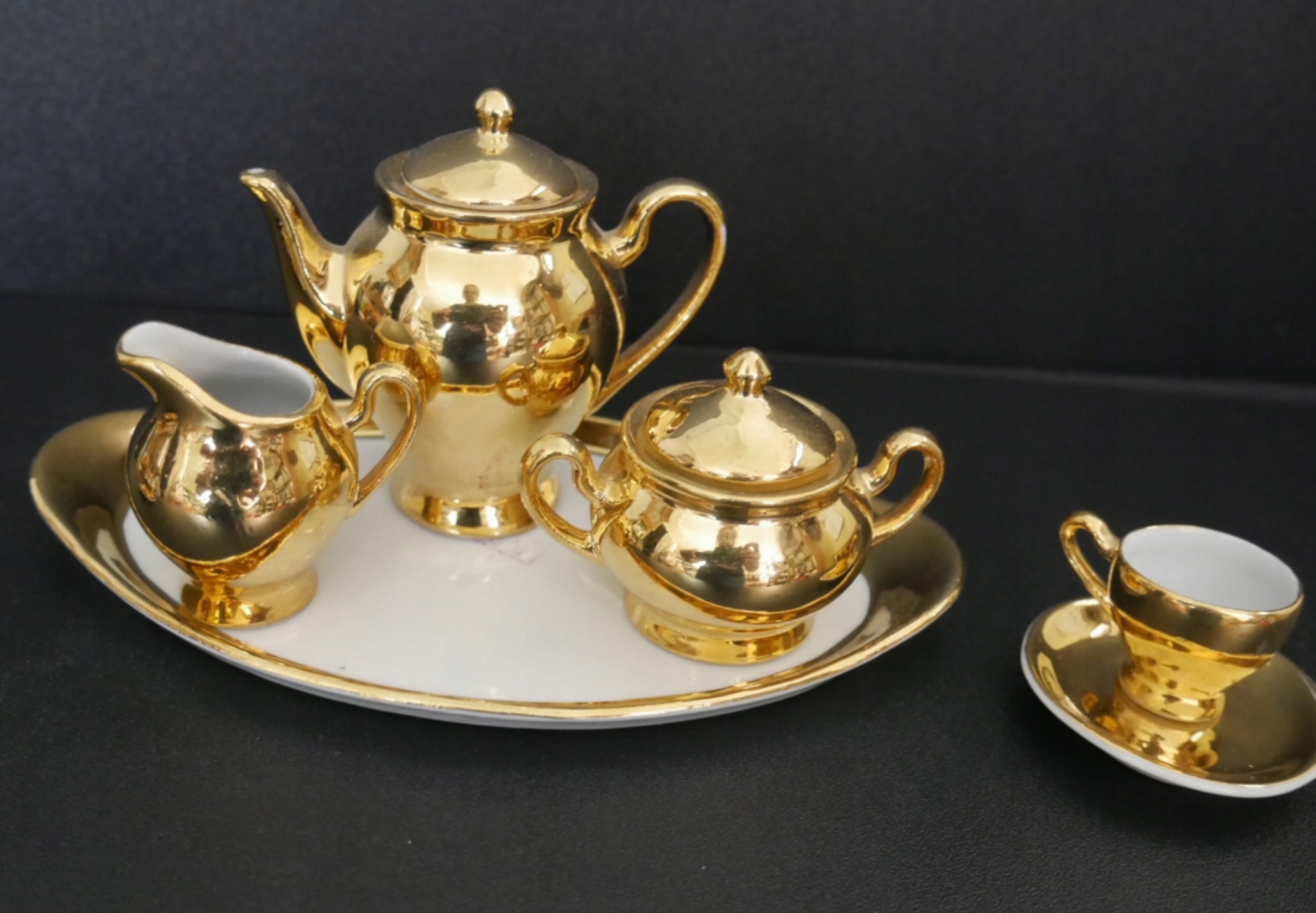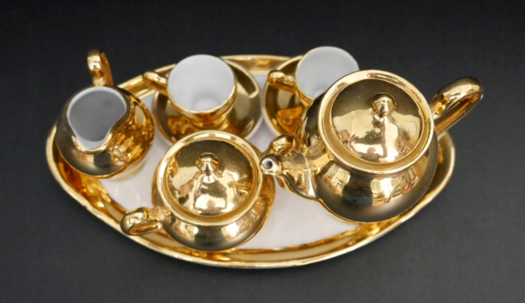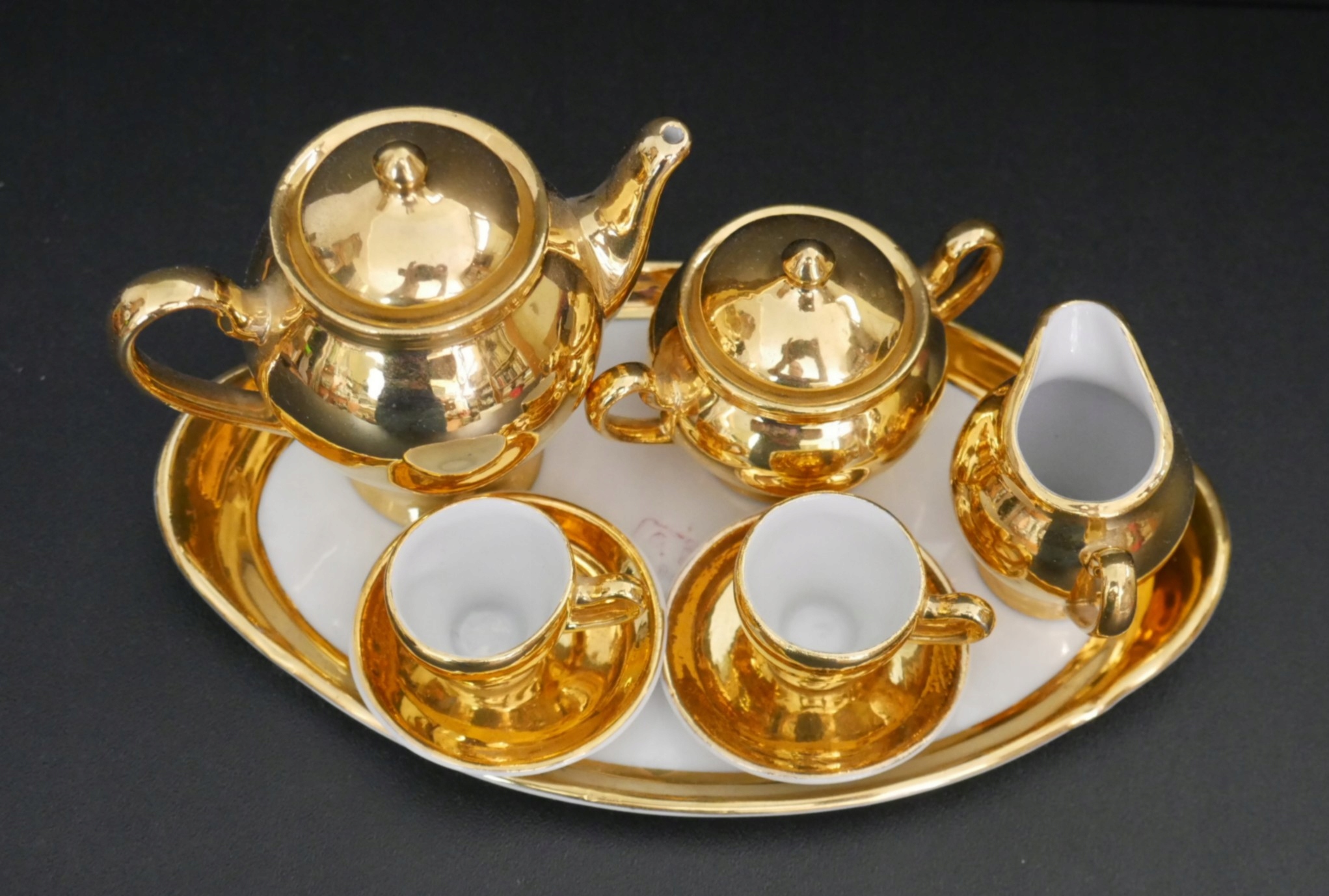 міні, колекційний набір: глечик, цукорниця, молочниця, 2 чашки з блюдцями, піднос, набір ззовні позолочений, штамп на підносі