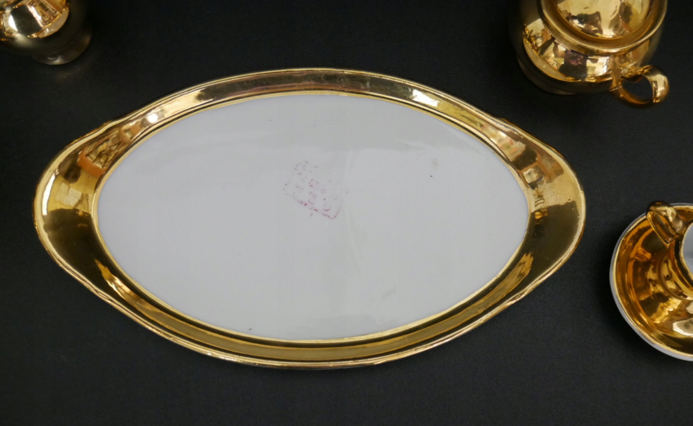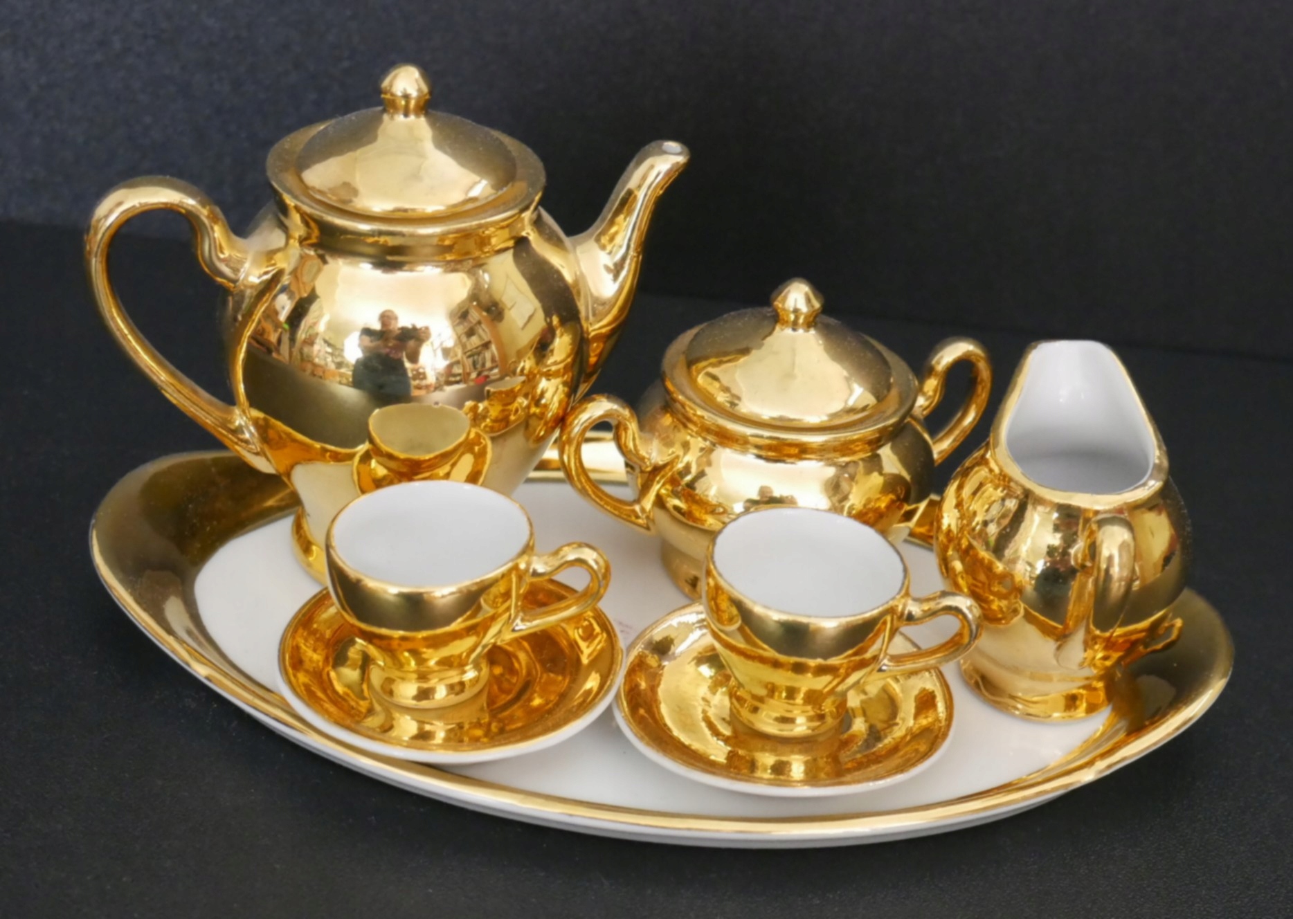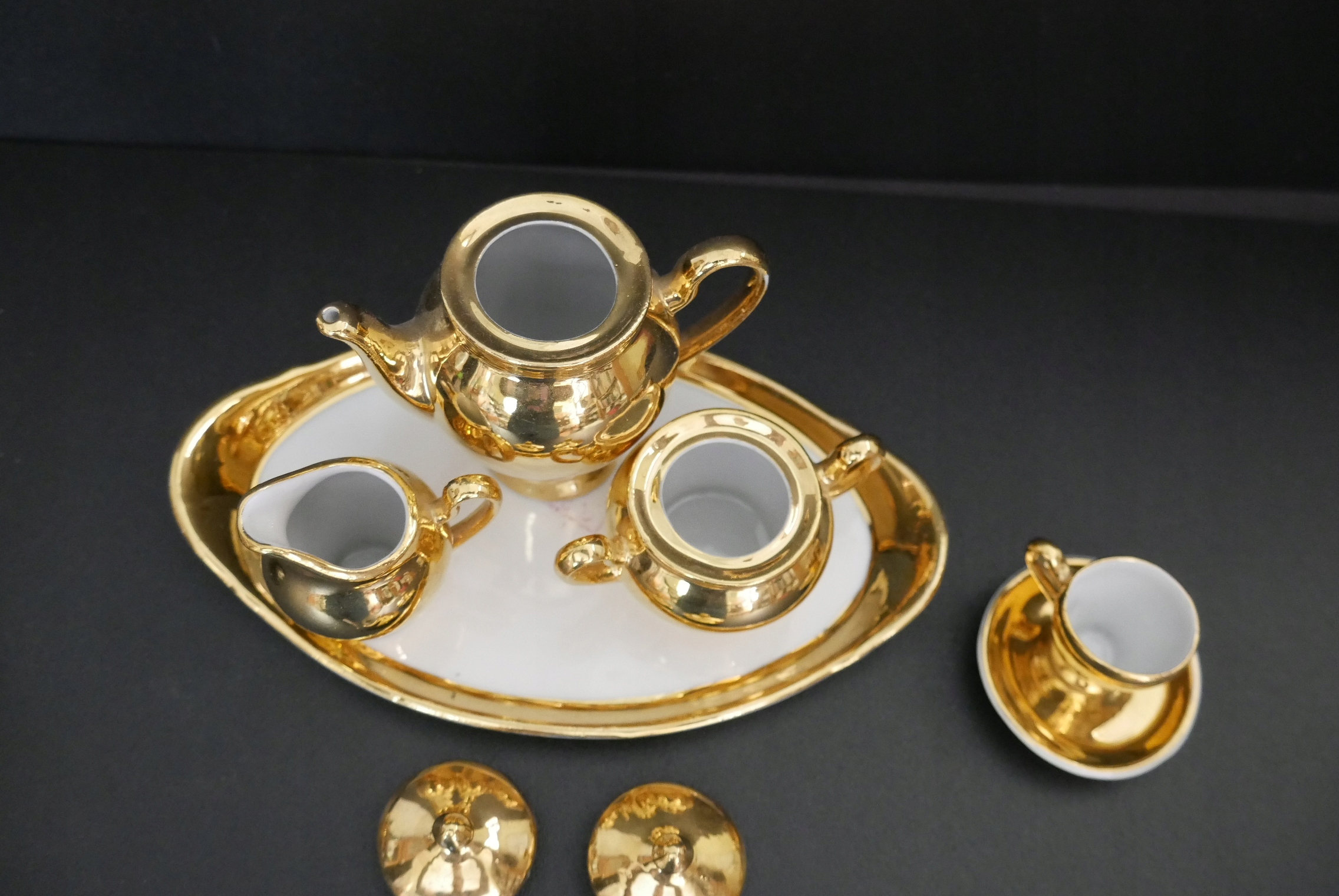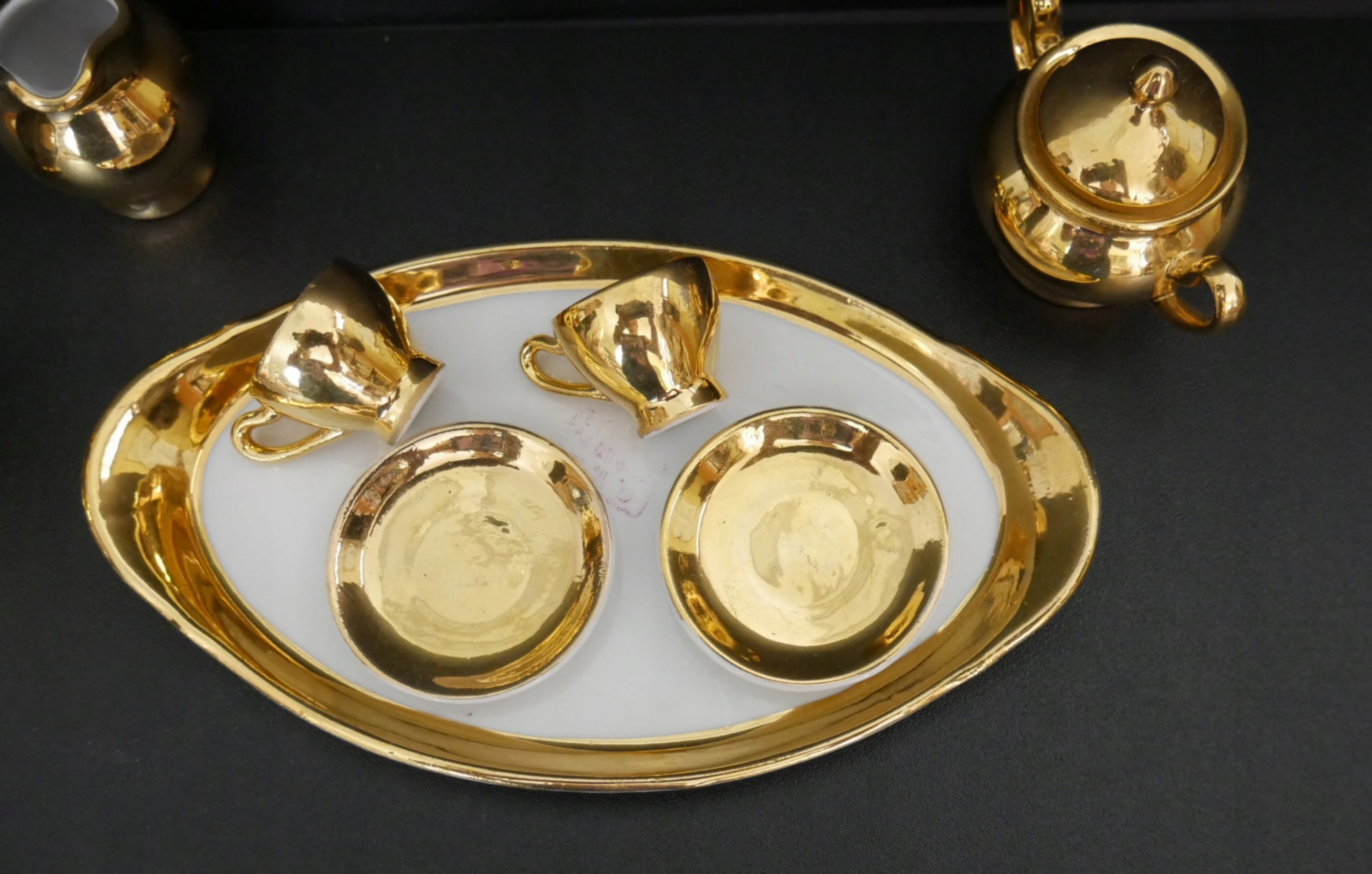міні, колекційний набір: глечик, цукорниця, молочниця, 2 чашки з блюдцями, піднос, набір ззовні позолочений, штамп на підносі
