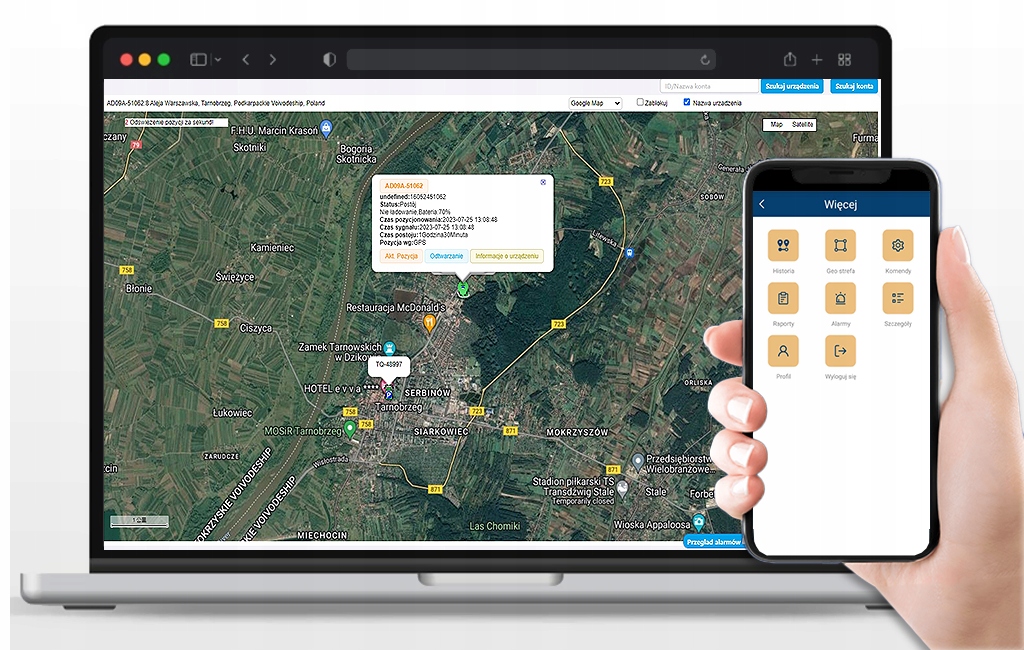 Масло локатора є готовим відстежувати положення з безкоштовної програми на телефоні та планшеті у польському . Ви також можете використовувати веб -сайт у браузері. Він підключений до безкоштовного сервера www , до якої надсилається інформація про місцезнаходження.