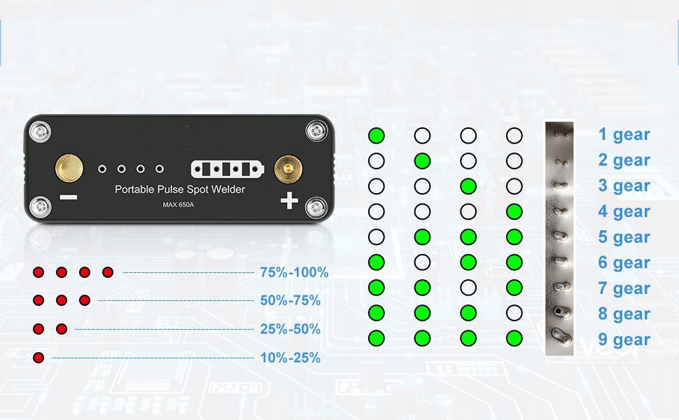 --- Високоякісний матеріал: Цей світловий, портативний зварник виготовлений з твердого, довговічного Корпус алюмінієвого сплаву, з анодованою поверхнею окислення, стійкий до зносу. і світлодіоди вказують на робочу передачу.
