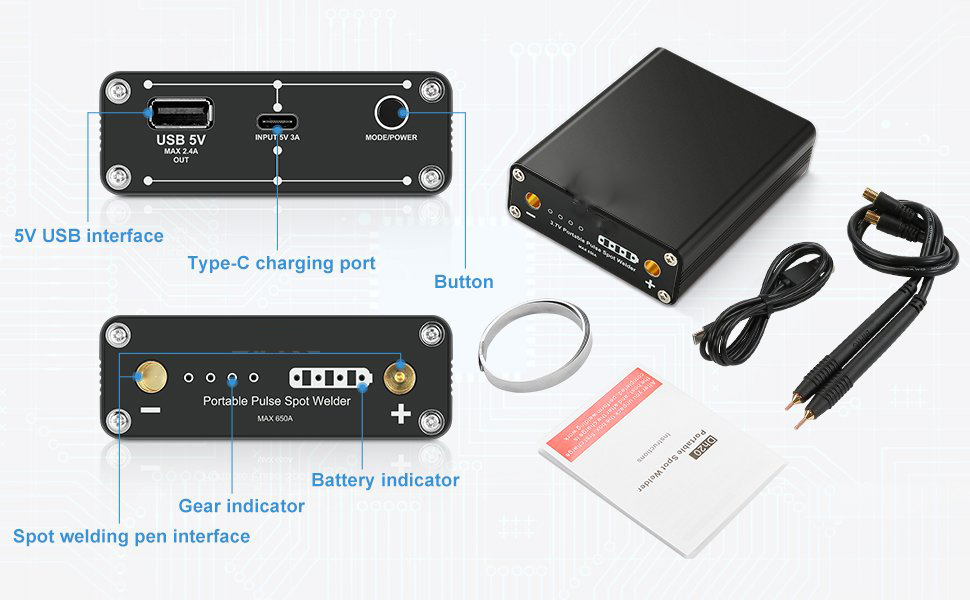 --- безпечне, надійне використання: зварювальник має низьку напругу, захист від переповнення та перевантаження, низька функція тривоги заряду акумулятора, автоматичне вимикання на низькому рівні заряду. -Функція Power Bank: Побудована велика потужність 5500 мАг, підтримує швидку зарядку мобільних пристроїв через USB 5 V 2.1 A, дуже комфортно.