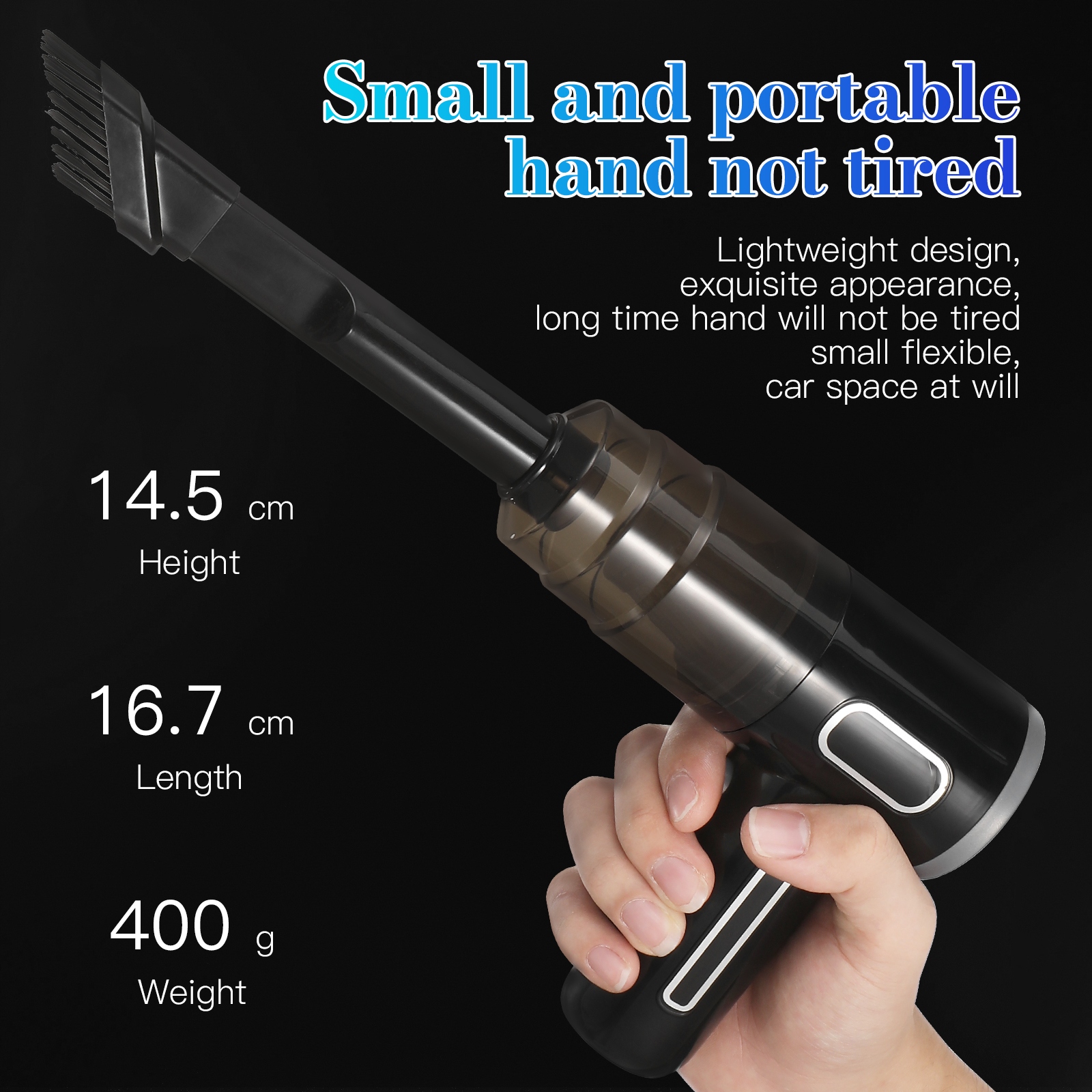 Цей маленький прибиральник вакууму автомобіля легкий і простий у використанні, ефективно видаляючи пил вдома та вдома. Він має сильне смоктання на рівні забруднення, дозволяє ефективно видалити бруд, залишки, і важко видалити місця. Починаючи з різних насадок, фари автомобілів можуть бути різними насадками для очищення різних куточків.