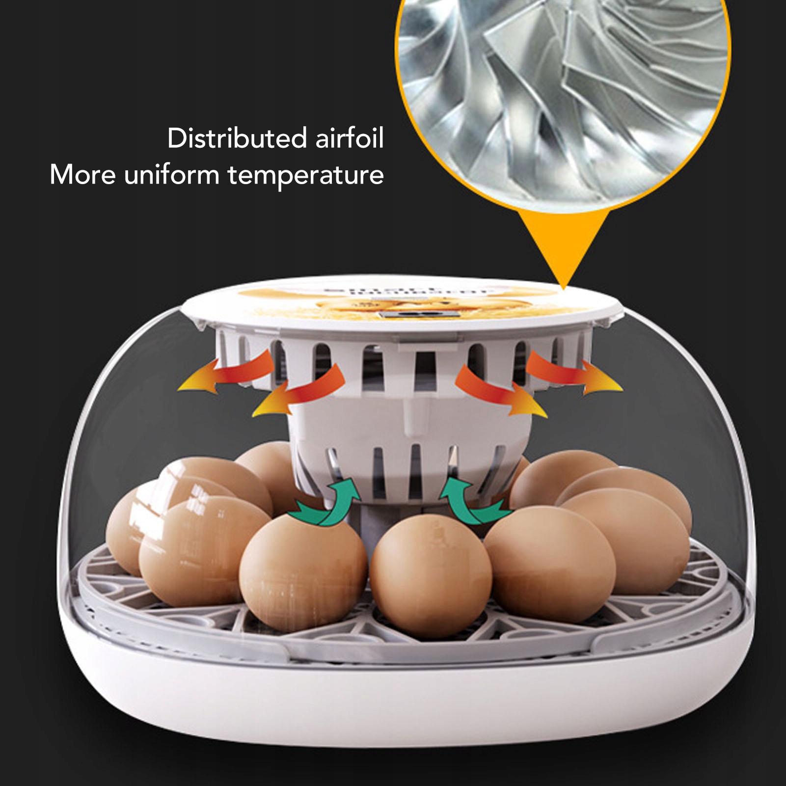 4. НАЙБІЛЬШ РІВНОМІРНИЙ ПОТОК ПОВІТРЯ: Цифровий інкубатор для яєць оснащено турбовентилятором із круглим розташуванням лопатей вентилятора та роздутими лопатями, що забезпечує більш рівномірну температуру.