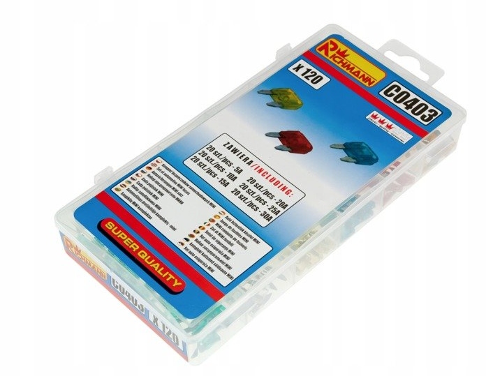 Набір містить 120 запобіжників шести розмірів; запобіжникам надано різні кольори, щоб легко відрізнити їх один від одного. Комплект запобіжників С0403 використовується при обслуговуванні або ремонті електрообладнання автомобіля.