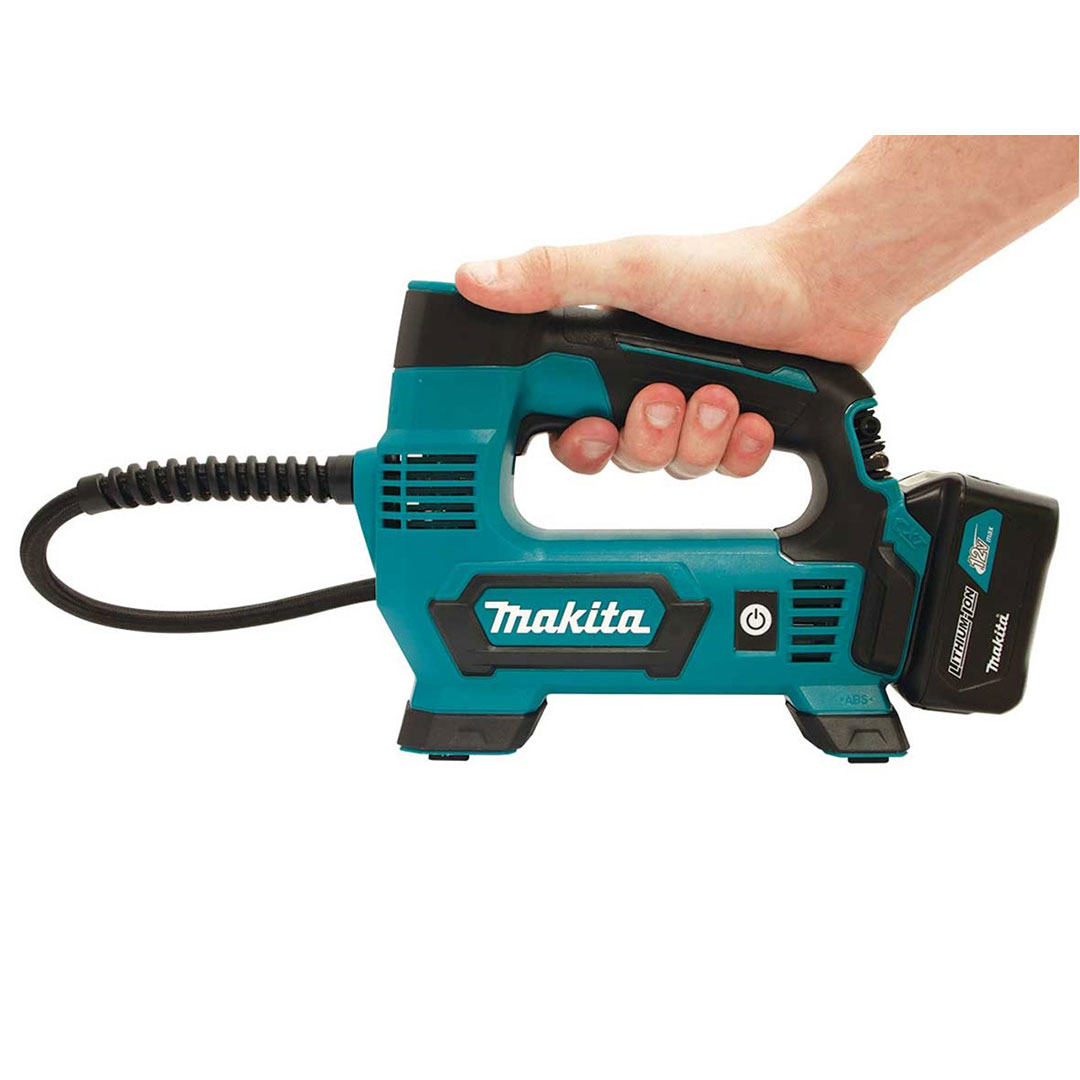 Акумуляторний міні-компресор 12 В MP100D Маленький компактний компресор Makita. Його основне завдання - накачування автомобільних і велосипедних коліс, м'ячів і матраців. Його компактні розміри означають, що його можна перевозити в багажнику автомобіля і він не займає багато місця. Компресор живиться від літій-іонної батареї 12 В серії CXT. Бездротова робота означає, що ми можемо використовувати його не лише в домашньому гаражі, але й на вулиці.