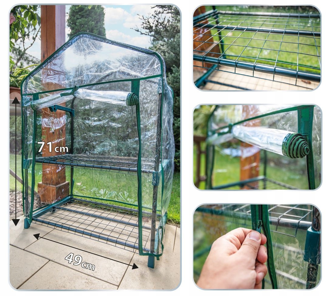 Теплиця оснащена двома полицями, що дозволяє ефективно використовувати простір. Це чудовий варіант для людей, які хочуть мати свіжу зелень, фрукти та овочі з власного саду, не потребуючи великого простору для традиційного вирощування.