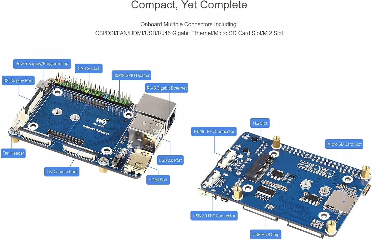 Базова плата Waveshare Mini, розроблена для обчислювального модуля Raspberry Pi. 4 потужні функції в невеликому пакеті. Підходить для оцінки Raspberry Pi CM4 або для інтеграції в кінцеві продукти.