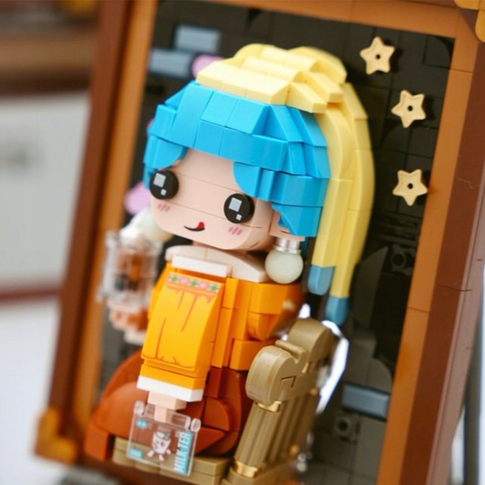 Тривимірне, чарівне зображення дівчини з перлинними сережками, зроблене з маленьких блоків. Кожен елемент стереоскопічного зображення представлений на мініатюрній моделі з блоків – бульбашковому чайнику. На сцені також з’являється картина художника. Відтворіть дівчину з перлинними сережками, малюючи блоки. Останній проект наповнить ваше життя прекрасною, мистецькою атмосферою. Виріб мініатюрний, приблизно на 25% менший за стандартні блоки.
