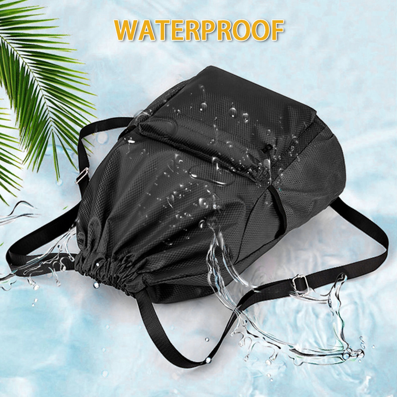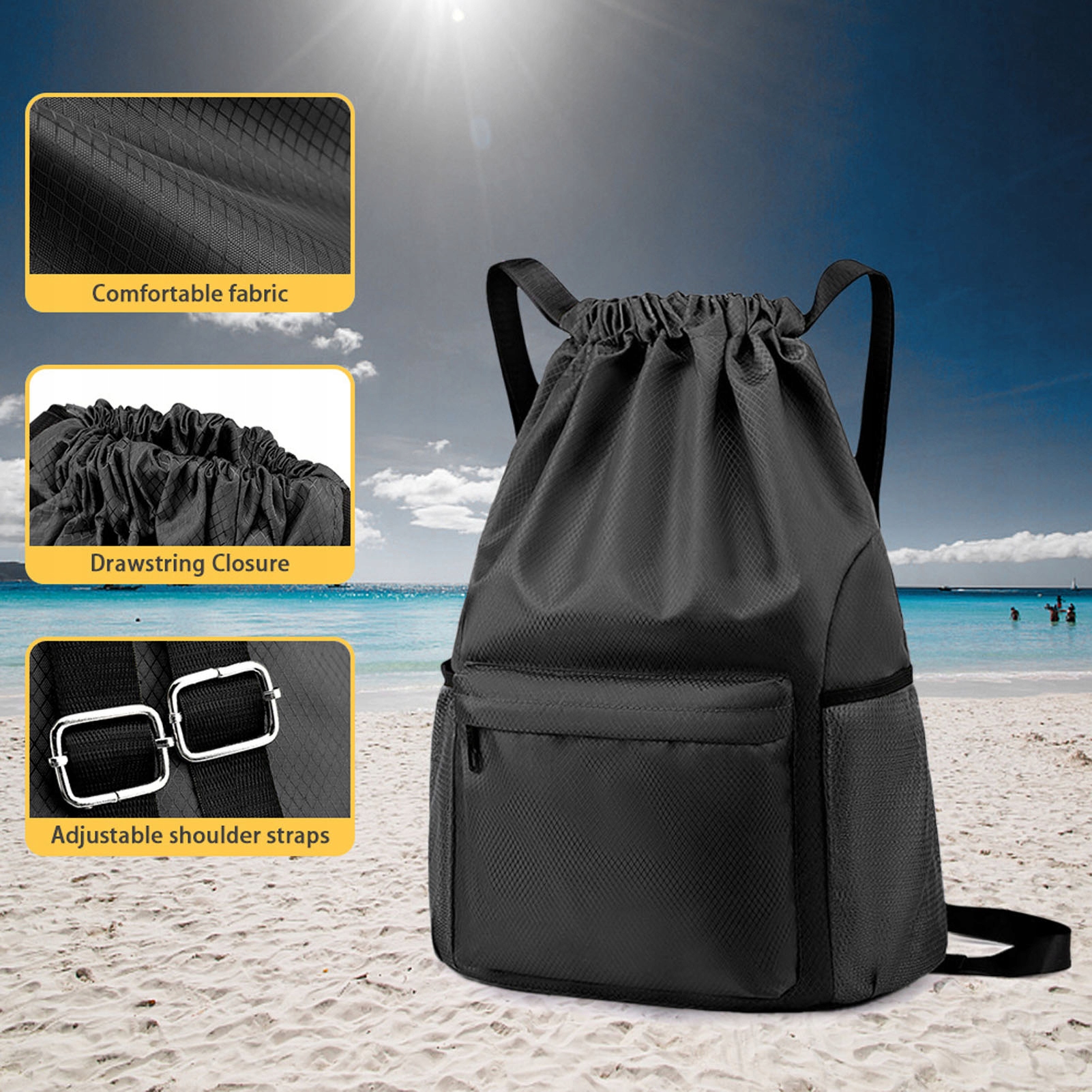 - Ця міні-сумка для плавання — водонепроникна сумка на шнурках, ідеальна для тренувань на відкритому повітрі та фітнес-вправ. Конструкція рюкзака з м’якою спинкою легка та зручна.