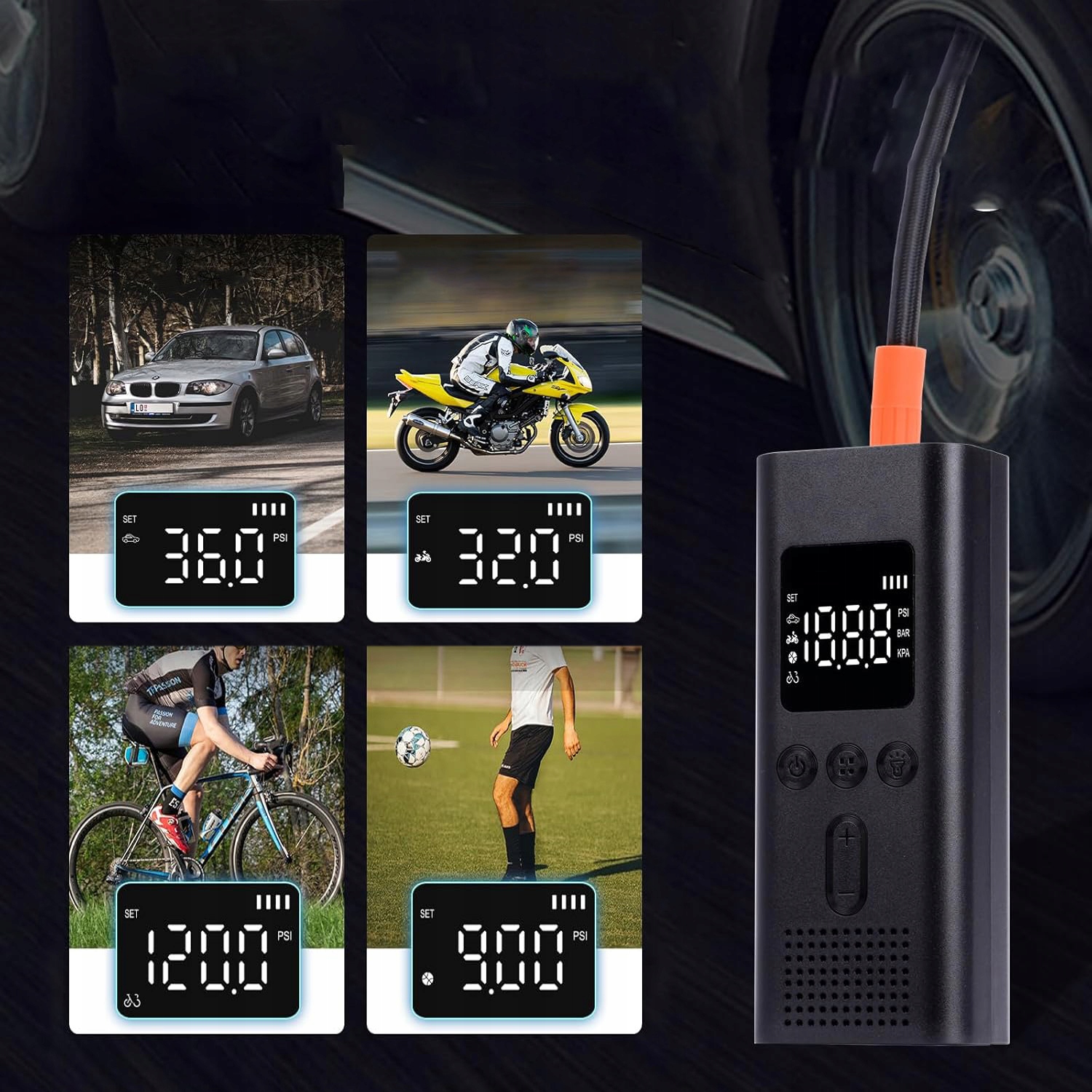 ✔ електричний велосипедний насос може швидко збільшити тиск повітря в шину автомобіля з 1,93 бар до 2,3 бару (від 28 фунт/кв.дюйм до 34 фунт/кв.дюйм) менше ніж за хвилину (розмір: 175/65r14 82t), а в расовій ширі від 1,93 бар. (28 фунт / кв.дюйм до 34 фунт / кв.дюйм) менше ніж за 2 хвилини. Тиск повітря коливається від 100 собак, а потужність до 150 к.с..
