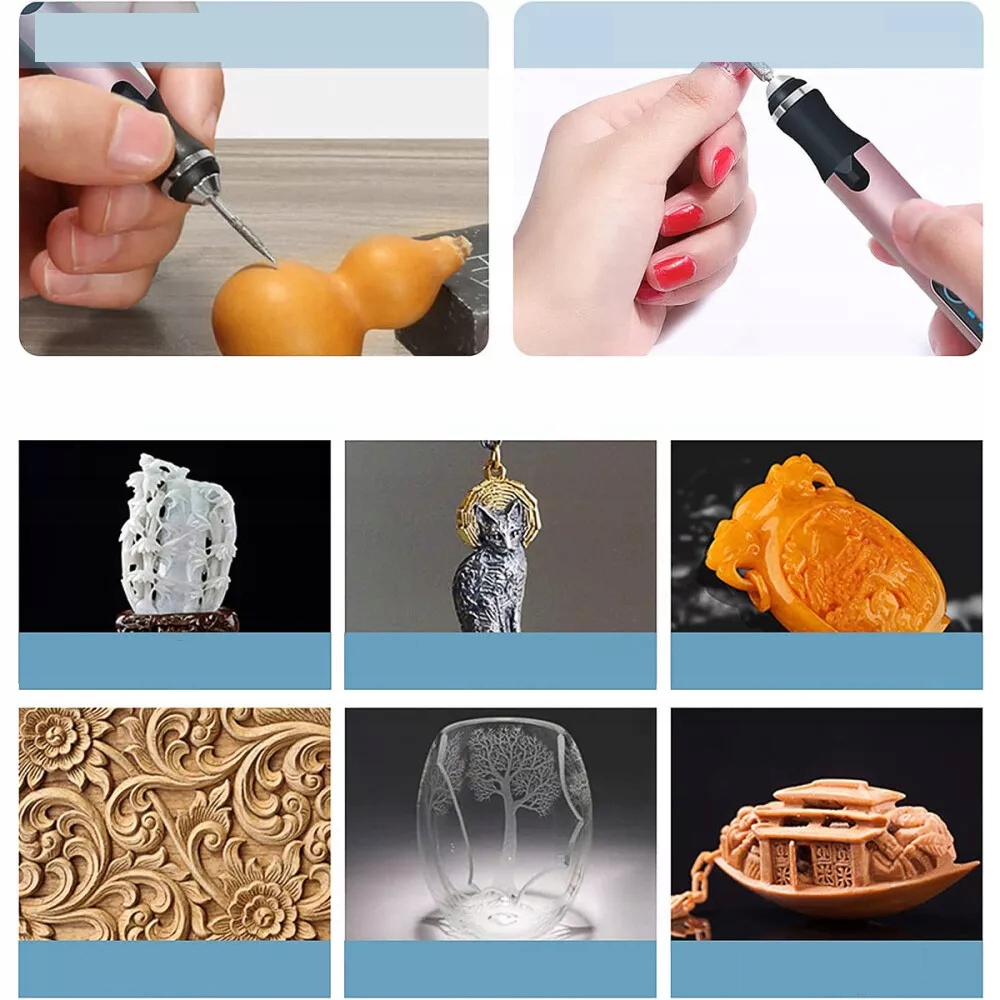 - Гравіруючу ручку можна використовувати як електричний гравірувальний верстат або інструмент для полірування, дозволяючи персоналізувати чи прикрасити практично будь-яку поверхню за лічені секунди, як-от метал, пластик, скло, кераміка, дерево, шкіра, діамант, камінь тощо.