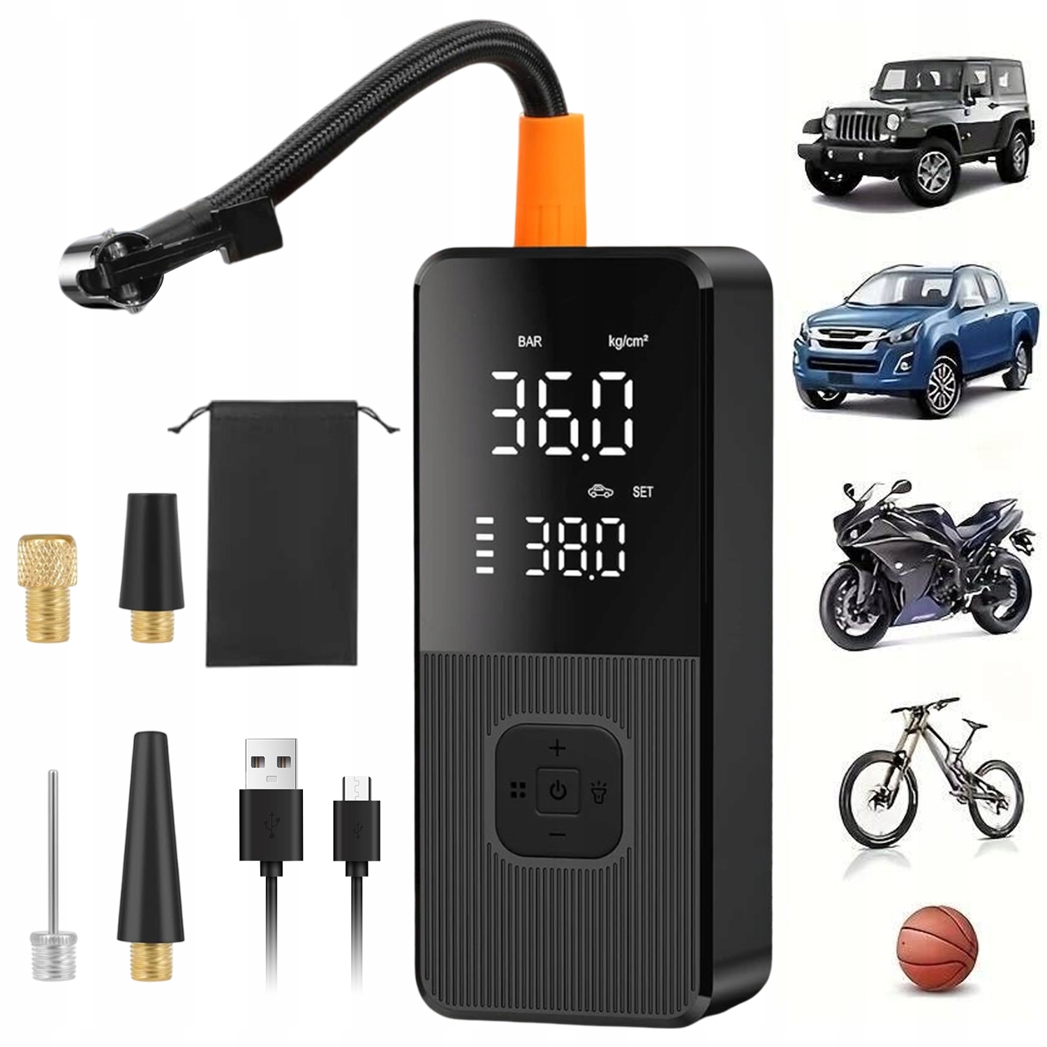 - Це портативний електричний повітряний насос, невеликий і легкий, із сумкою для зберігання. У набір входять насадка Schrader, насадка Presta та голка для накачування м’яча, щоб ви могли легко накачувати автомобілі, велосипеди, електровелосипеди, мотоцикли, а також баскетбольні та футбольні м’ячі.