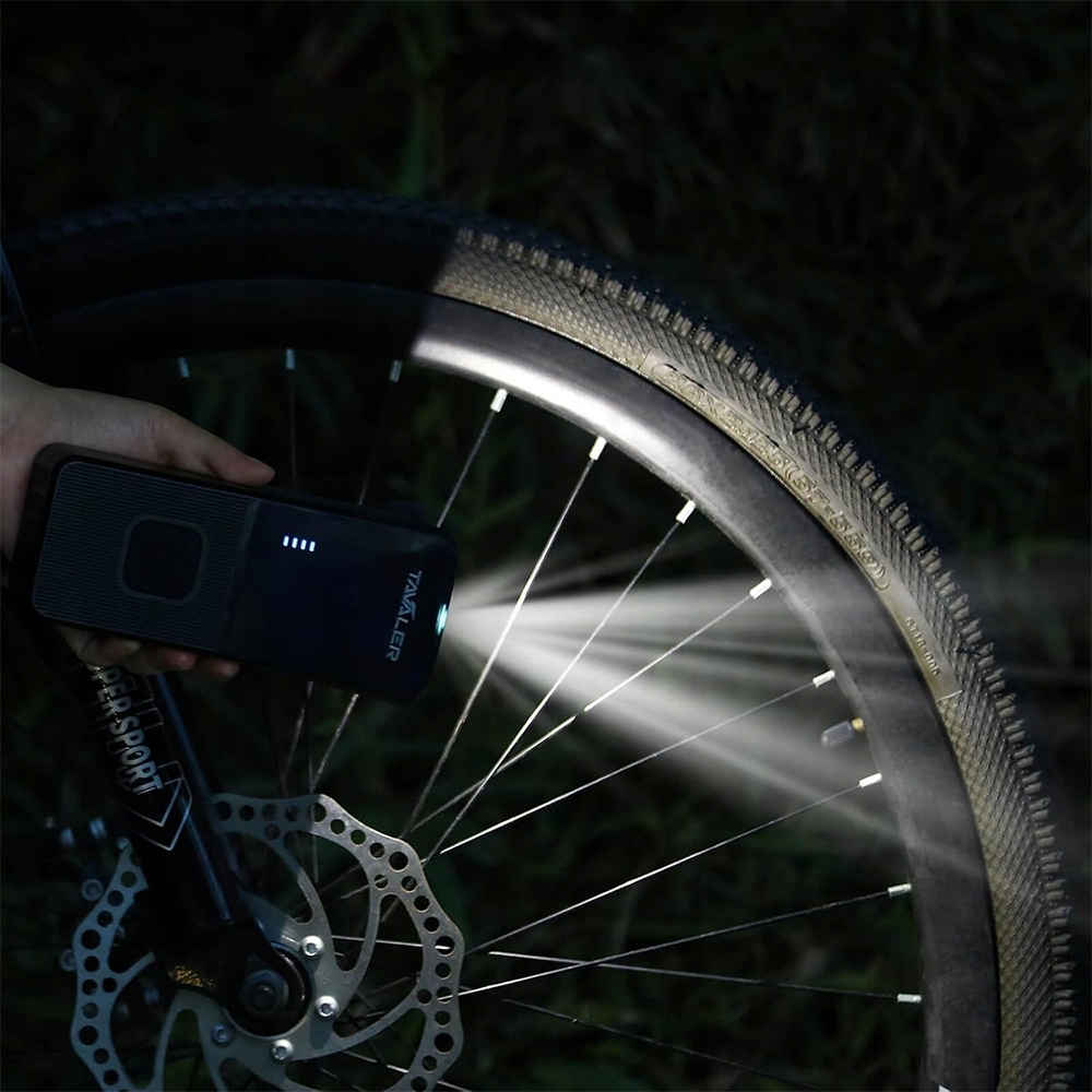 - Електровелосипед із повітряним насосом оснащено функцією ліхтарика, яка покращує видимість у нічний час. Також можна використовувати як освітлення для обслуговування.