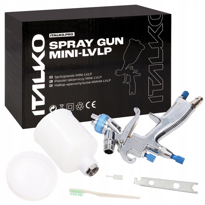 Професійний міні-пістолет, виготовлений за технологією LVLP - (Low Volume Low Pressure), яка поєднує в собі найкращі характеристики систем HP - (низький попит на повітря) і HVLP - (працює при нижчому тиску, що зменшує розбризкування фарби на пофарбованій поверхні, таким чином зменшуючи втрати матеріалу).