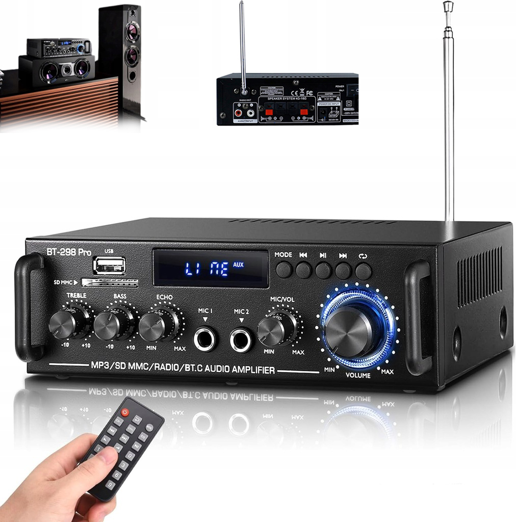 - Аудіопідсилювач Bluetooth сумісний із двома пасивними динаміками 4–16 Ом. Підсилювач з дистанційним керуванням дозволяє дистанційно налаштовувати аудіо, зчитує SD-карти та USB-MP3-плеєри, підтримує бездротове з’єднання BT, оснащений роз’ємом США, простий у використанні та ідеально підходить для систем домашнього кінотеатру