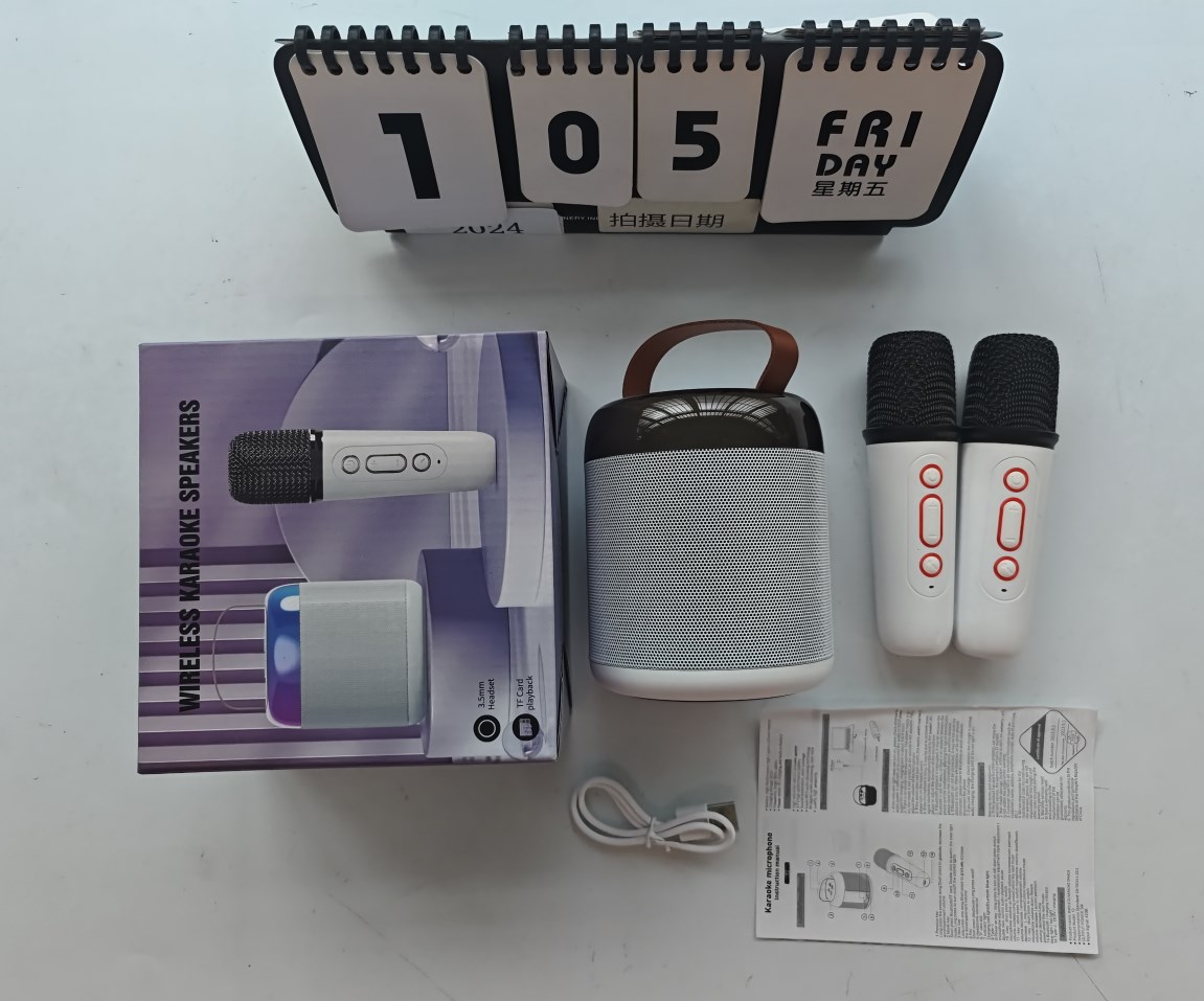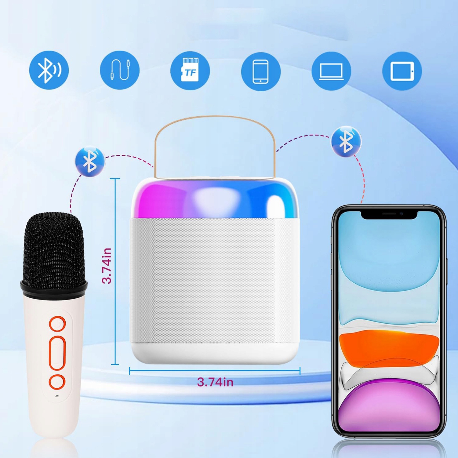 - З двома бездротовими мікрофонами, простими клавішами керування та миганнямСвітлодіодні підсвічування Підтримує карту Micro TF, підключення AUX і режим OTG.