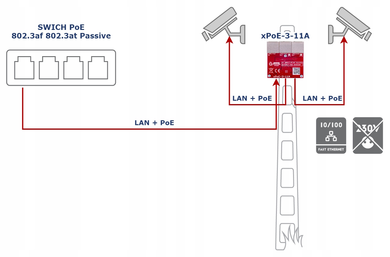 xPoE-3-11A регенерує мережевий сигнал і передає живлення PoE на вибрані виходи. Найчастіше використовується як "підсилювач" для розширення мережі на ділянках довжиною понад 100 м.