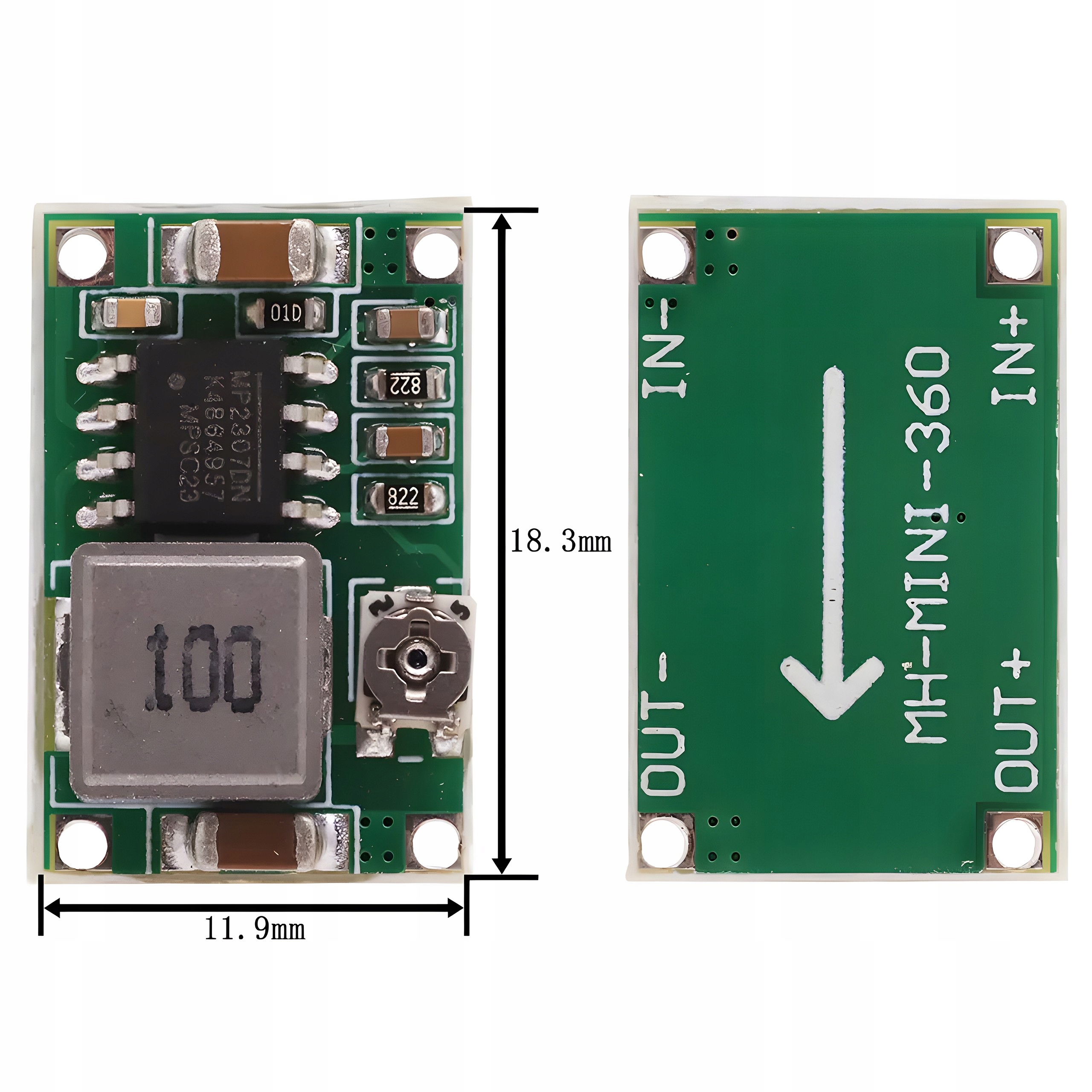 У нашому модулі ви знайдете чіп MP2307DN. Ця схема є ключовим елементом нашого продукту, забезпечуючи ефективне перетворення напруги. MP2307DN — стабільний стабілізатор напруги, який ідеально підходить для різноманітних застосувань. Завдяки наявності системи наш модуль гарантує точний контроль напруги, що важливо в проектах, де стабільність і надійність є вирішальними.
