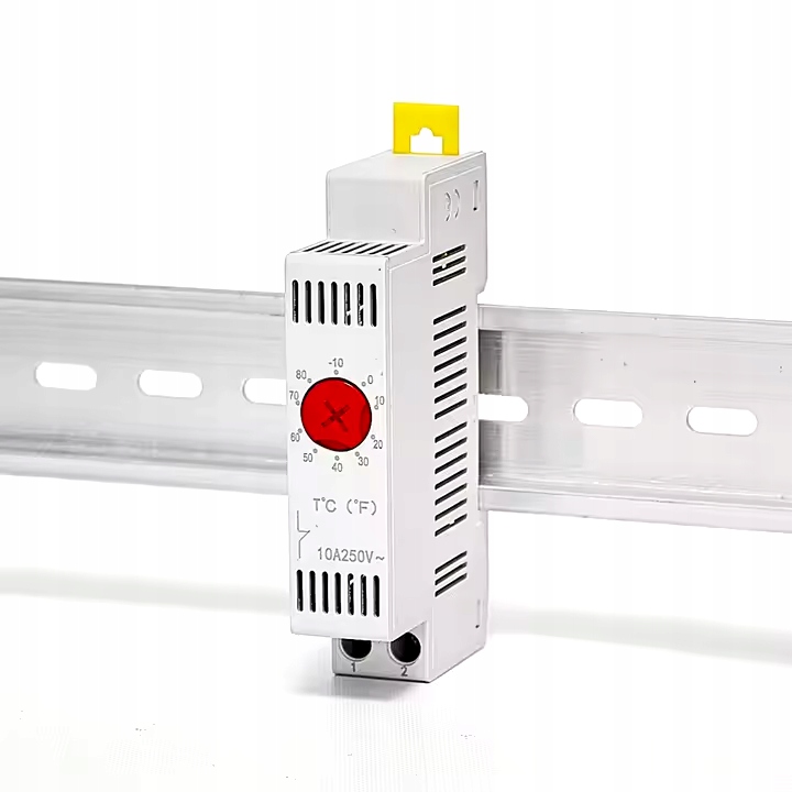 невеликий корпус монтажу в гардеробах для розподільних пристроїв з біметальними стрибками. Мініатюрний набряк термостата (відкриття контакту при зростаючій температурі типу NC) є надзвичайно корисним і простим пристроєм. Він працює дуже просто, ця модель - це тип нагріву, тобто якщо температура опускається нижче набору, його вихід включається в включення нагрівального пристрою. Коли температура перевищує налаштування, термостат відключає ланцюг.