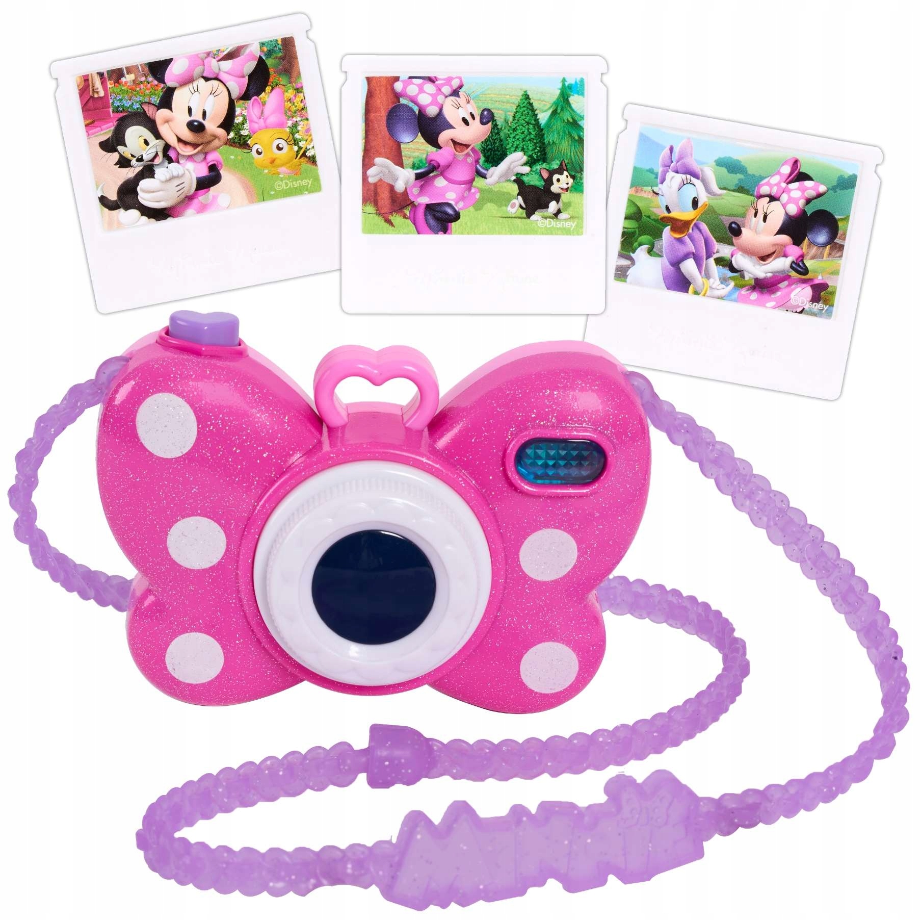 Цей чарівний набір дозволить дітям розважитись у фотографа з рожево-білим пристроєм у формі лука. Його основна частина вкрита блискітками, містить лінзу, спалах і фіолетову кнопку. Додатково вона оснащена ремінцем, який дозволяє носити камеру на плечі. Має світлові та звукові ефекти, тому імітує справжній пристрій. У набір також входять 3 фотографії Мінні.