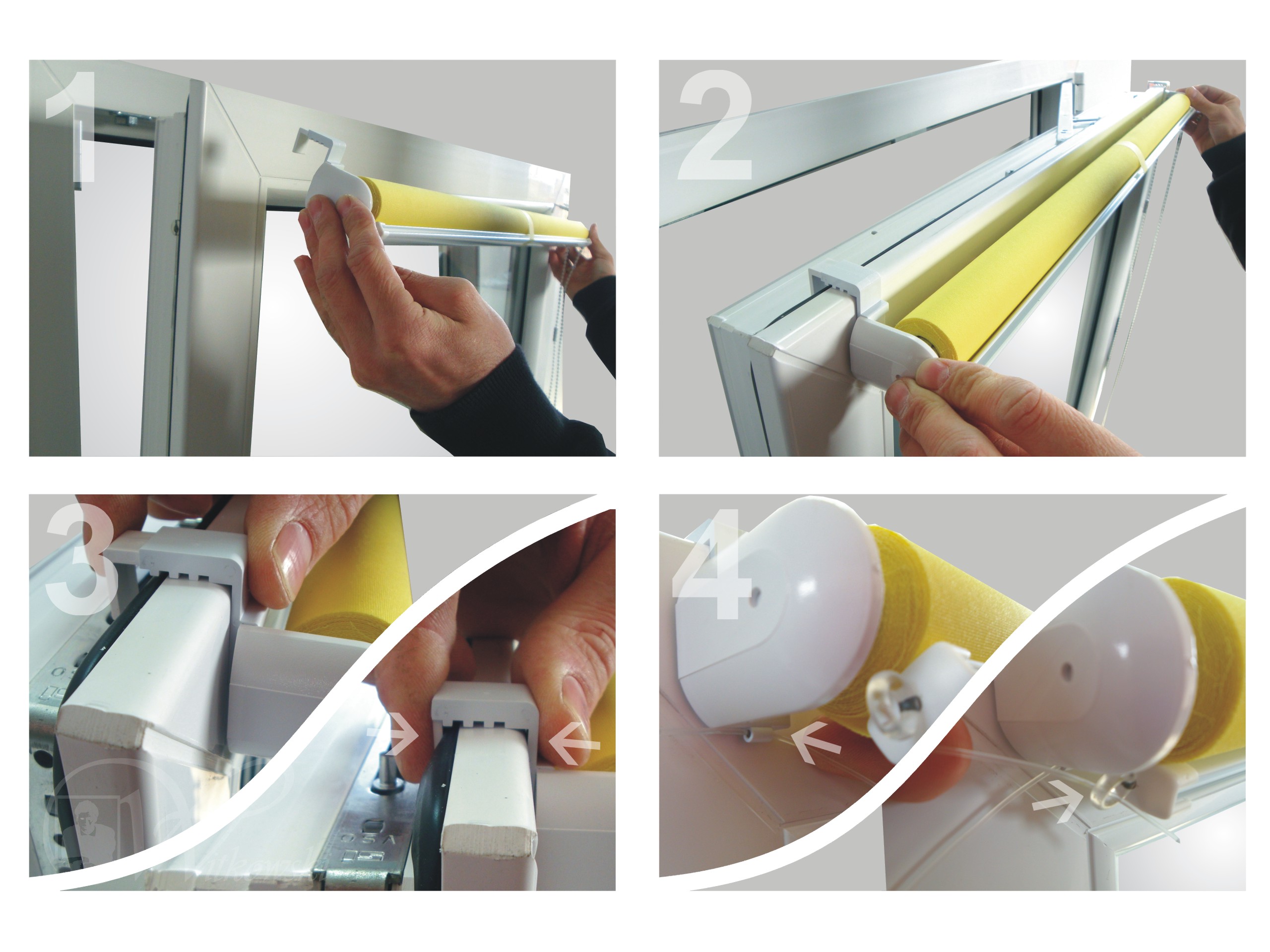 - Після розпакування рулонна штора готова до встановлення. Будь ласка, встановлюйте рулонні штори згорнутим матеріалом - будь ласка, не відривайте стрічку, що тримає матеріал. - При відкритому вікні, тримаючись за бічні механізми рулонних штор, одягніть готову рулонну штору, підчепивши верхній край віконної рами (фото 1 і 2).