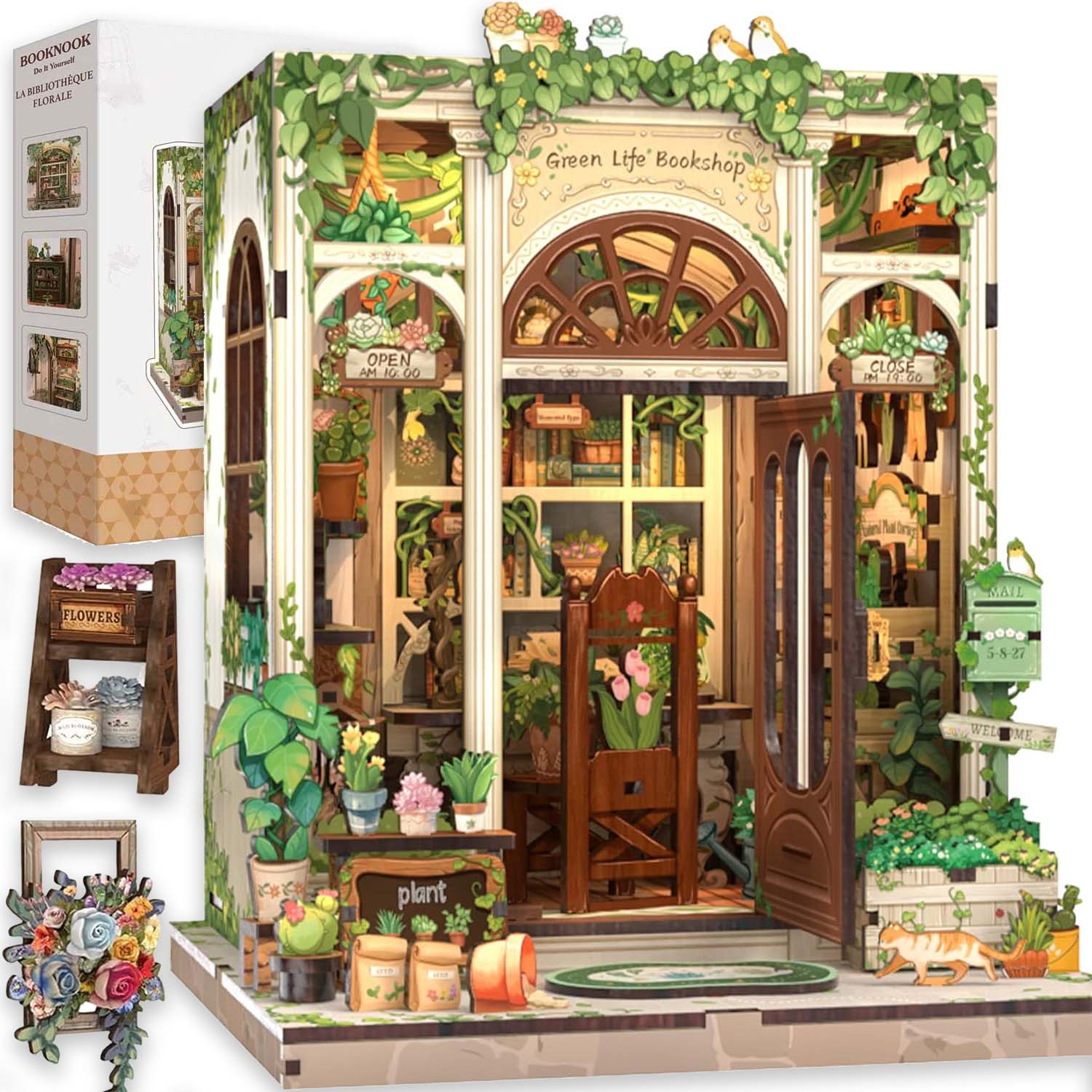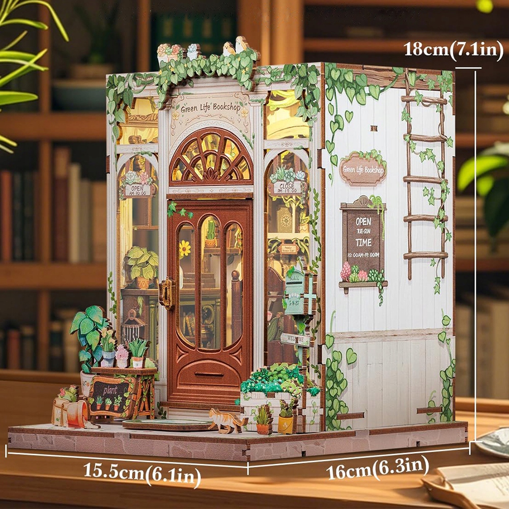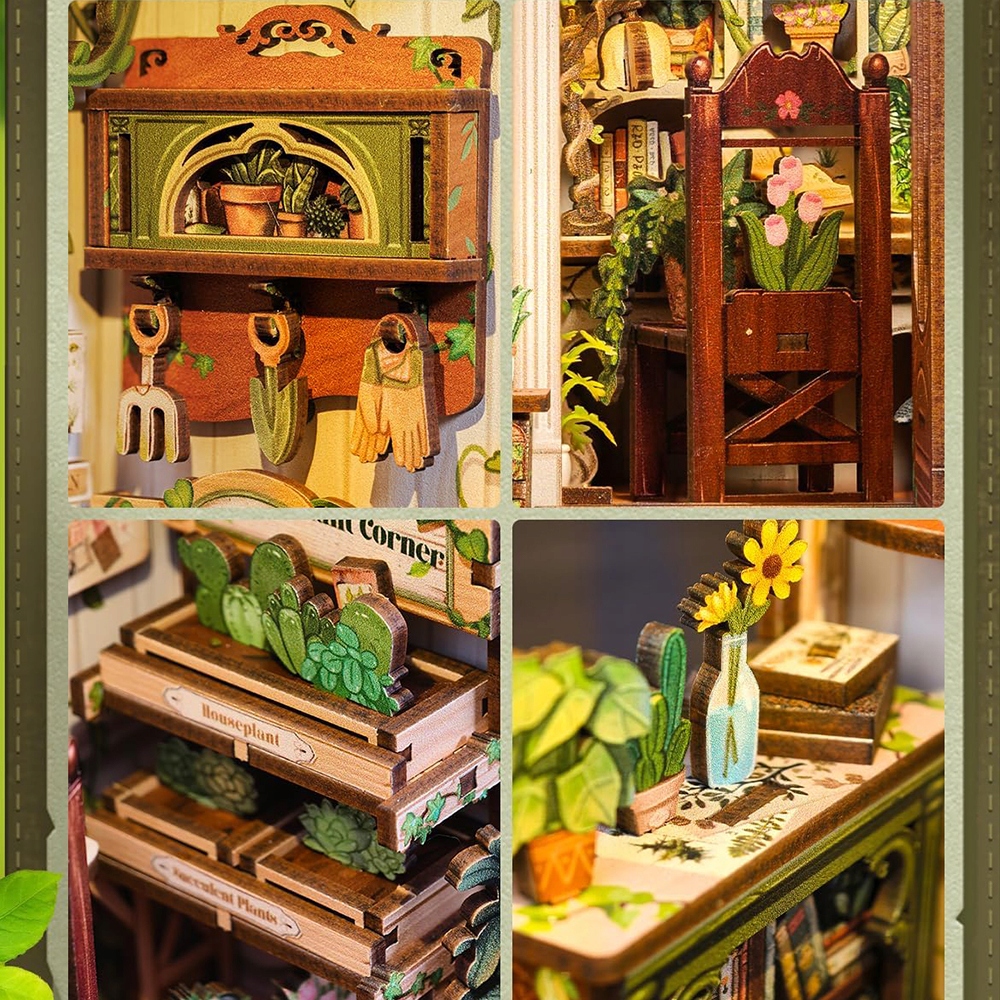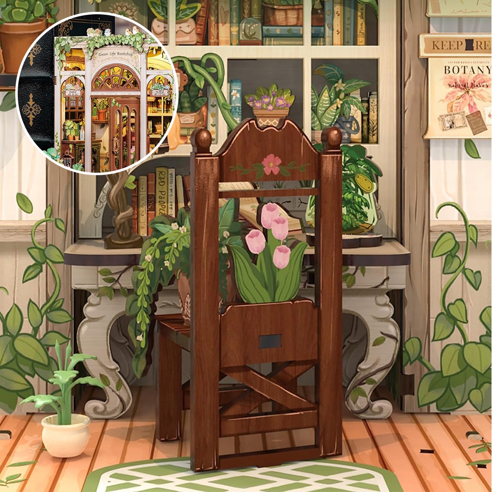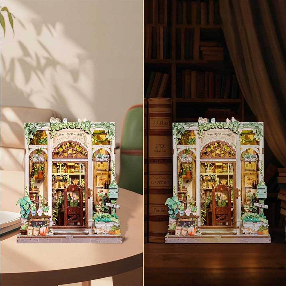 - 🧩Набір дотримується теми зеленого книжкового магазину з такими елементами, як квіти, зелені рослини та книги, що є надзвичайно елегантним.