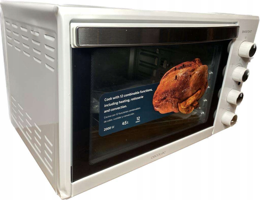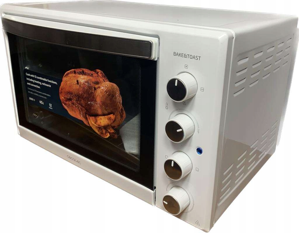 Оснащений лотком для крихт для легкого очищення. Оснащений внутрішнім освітленням, яке допомагає контролювати стан приготування, а також міцними подвійними скляними дверцятами, які допомагають підтримувати температуру. Він готує конвекцію однорідно з повітрям, що оточує їжу, отримуючи делікатніші та смачніші результати. 12 способів приготування завдяки 12 комбінованим функціям нагрівання, гриля та конвекції. Він включає обертовий вертел, який дозволяє смажити курку з температурою, розподіленою в діапазоні 360º. Велика настільна піч об'ємом 45 л і потужністю 2000 Вт забезпечує високу ефективність, покрита білим лаком.