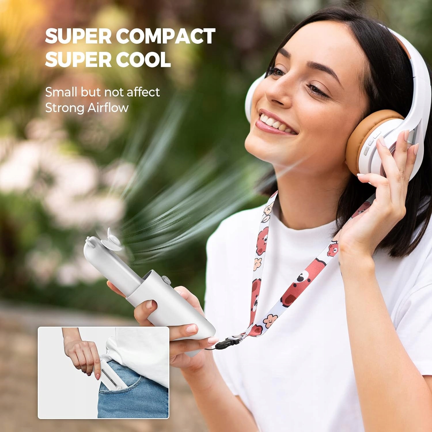 - Портативний розмір: як і всі великі портативні вентилятори, цей портативний вентилятор надзвичайно легкий і компактний. Завдяки овальній формі (1,4 x 1,5 x 4,7 дюйма, вага: 0,29 фунта) цей акумуляторний вентилятор може приховати лопаті вентилятора, він маленький і його легко покласти в кишеню або сумочку. Що робить його ще більш корисним під час подорожей, так це те, що він постачається зі шнурком, щоб ви могли повісити його на руках або в туристичному рюкзаку.