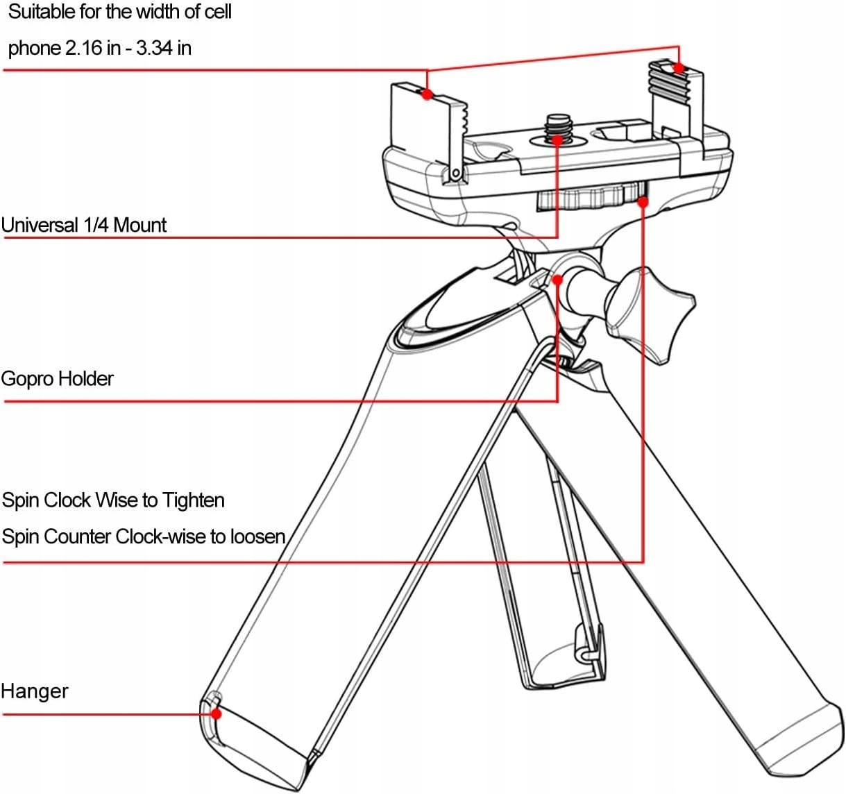- Компактний і легкий: ми розробили наш штатив, щоб він був компактним і надлегким з дистанційним затвором, смартфон і кріплення GoPro зручно заховані в кожній ніжці