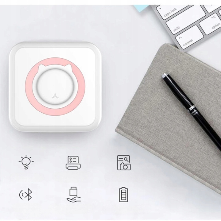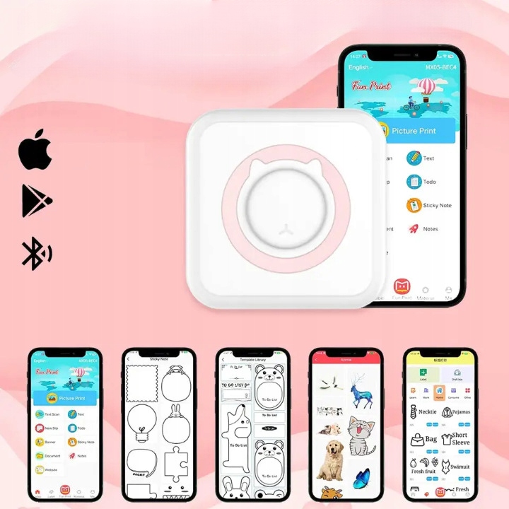 Тепловий принтер підключається до телефону за допомогою Bluetooth. Просто завантажте безкоштовну програму для друку, увімкніть Bluetooth на телефоні та підключіться до однієї кнопки з пристроєм C15. Додаток містить велику кількість бібліотек матеріалу, кілька шрифтів, режими редагування тексту та інші функції.