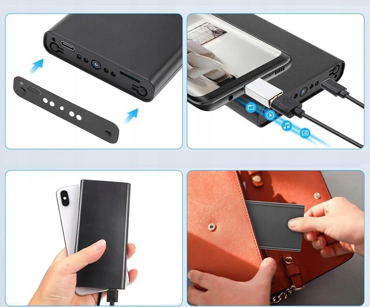 Невеликий пристрій, що поєднує в собі функцію powerbank із вбудованою шпигунською камерою HD із широким кутом огляду 160°. Ідеально підходить для спостереження за квартирами, офісами, людьми похилого віку, дітьми, а також для охорони майна. Він підтримує нічний запис з активним інфрачервоним портом, виявлення руху, циклічний запис і безперервний запис до 55 годин. Завдяки підтримці карток microSD до 512 ГБ у вас завжди є доступ до збережених матеріалів.