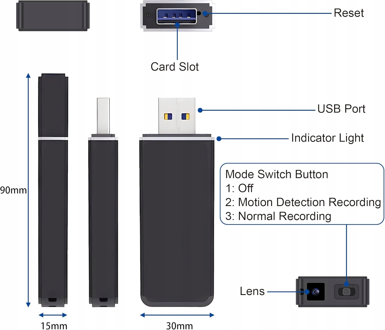 - Проста функція, не потрібно завантажувати програму. Для зміни режимів потрібна лише одна кнопка. Натисніть кнопку 1, щоб вимкнути пристрій. Натисніть кнопку 2, щоб перейти в режим запису при виявленні руху. Натисніть кнопку 3, щоб увійти в звичайний режим запису.