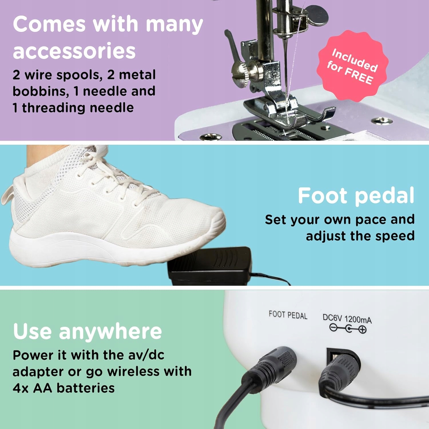 Швейну машину можна використовувати без проводів. від 4 батарейок АА! Якщо ви хочете взяти машину з собою, вона досить компактна та легка, щоб поміститися у вашій сумці. Ідеально!