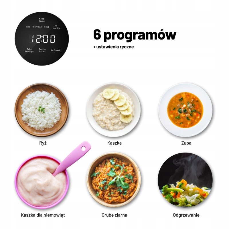 Рисоварка Lauben — це пристрій, який забезпечує швидке та здорове приготування їжі. Завдяки 6 попередньо запрограмованим функціям - рис, каша, суп, розігрівання, дитяча каша - ви можете легко приготувати різноманітні страви. Сенсорний екран полегшує роботу, а функція відкладеного старту дозволяє приготувати страву вчасно. Функція Keep Warm зберігає їжу теплою протягом багатьох годин, а захист від переповнення та технологія Cool Touch забезпечують безпечне використання.