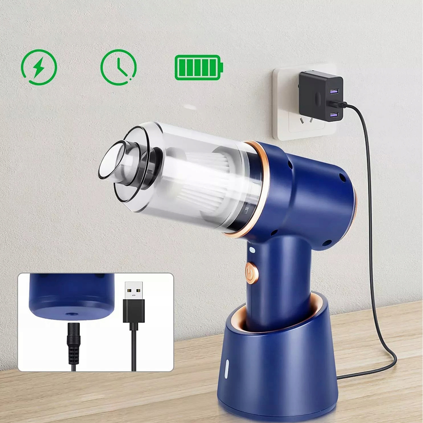 💎 Переможець тесту акумулятора для електричних ручних пилососів має вбудовану батарею на 6000 мАг із роз’ємом швидкої зарядки. У комплект багаторазового пилососа входить зарядний кабель USB-C, тому ви можете зручно заряджати пилосос за допомогою автомобільного зарядного пристрою, портативного адаптера живлення, ноутбука, акумуляторної батареї та іншими способами. Зелений індикатор на кабелі даних нагадує вам, коли акумулятор повністю заряджено. Ładowanie trwa tylko 3 godziny.🌟🌟