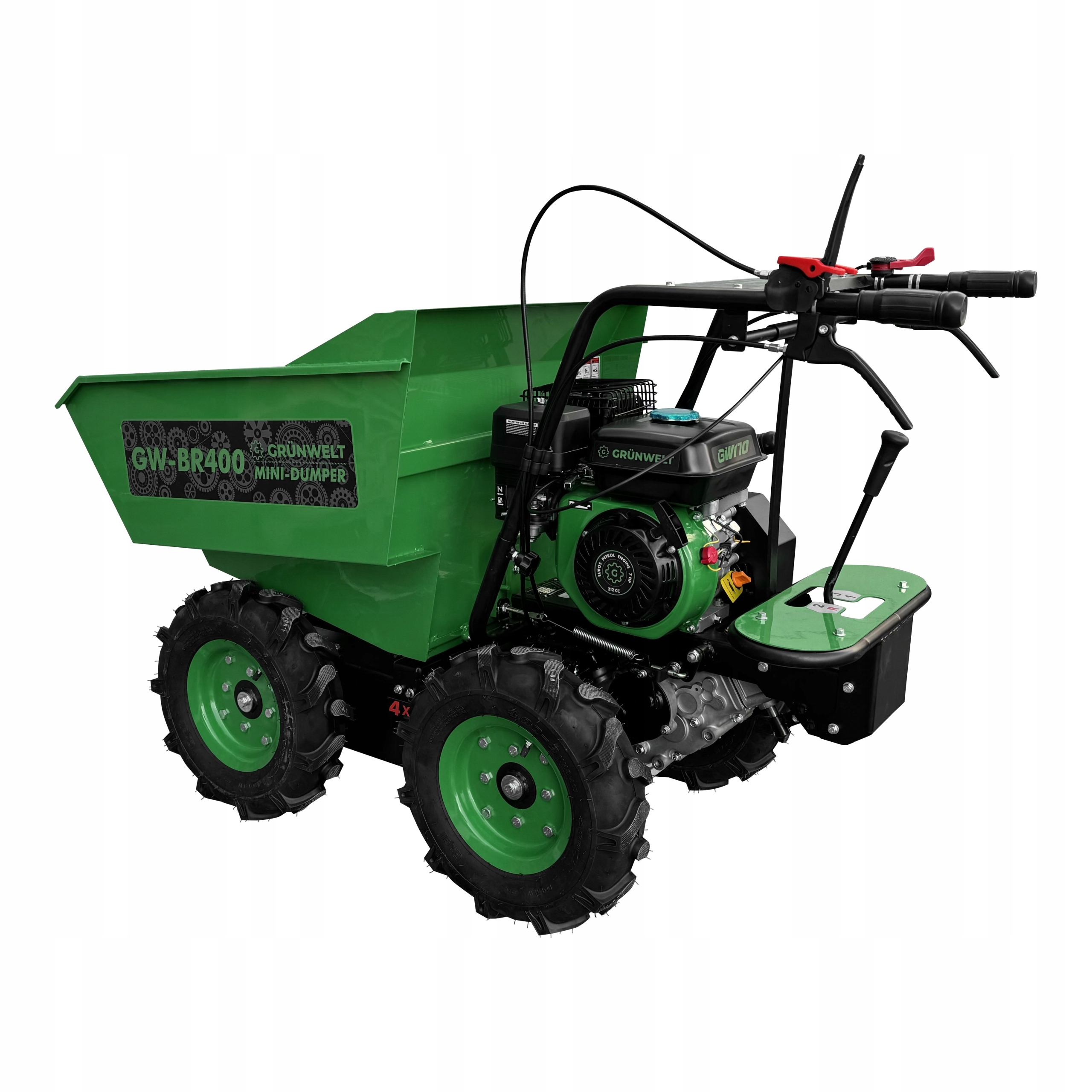 Grünwelt GW-BR400 - це універсальний агрегат, який використовується для транспортування та транспортування різних видів вантажів будь-якого об'єму, форми та розміру, вагою до 400 кг. Дана модель оснащена бензиновим двигуном Grünwelt GW170F-T, який забезпечує надійну та ефективну роботу при великих навантаженнях. Ремінна муфта полегшує догляд за конструкцією. Чотириступінчаста коробка передач дозволяє оператору вибрати оптимальну робочу швидкість. Ручний підйом кузова.