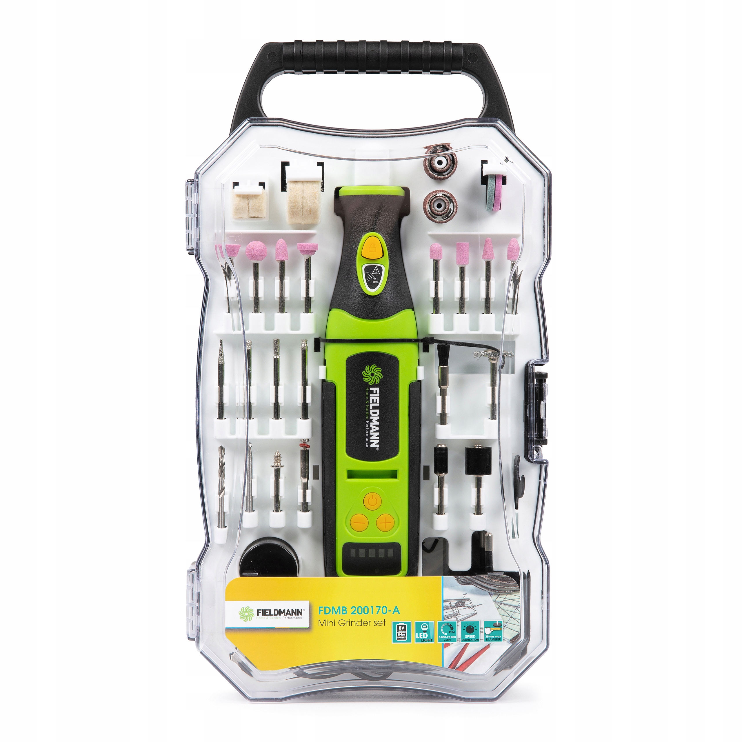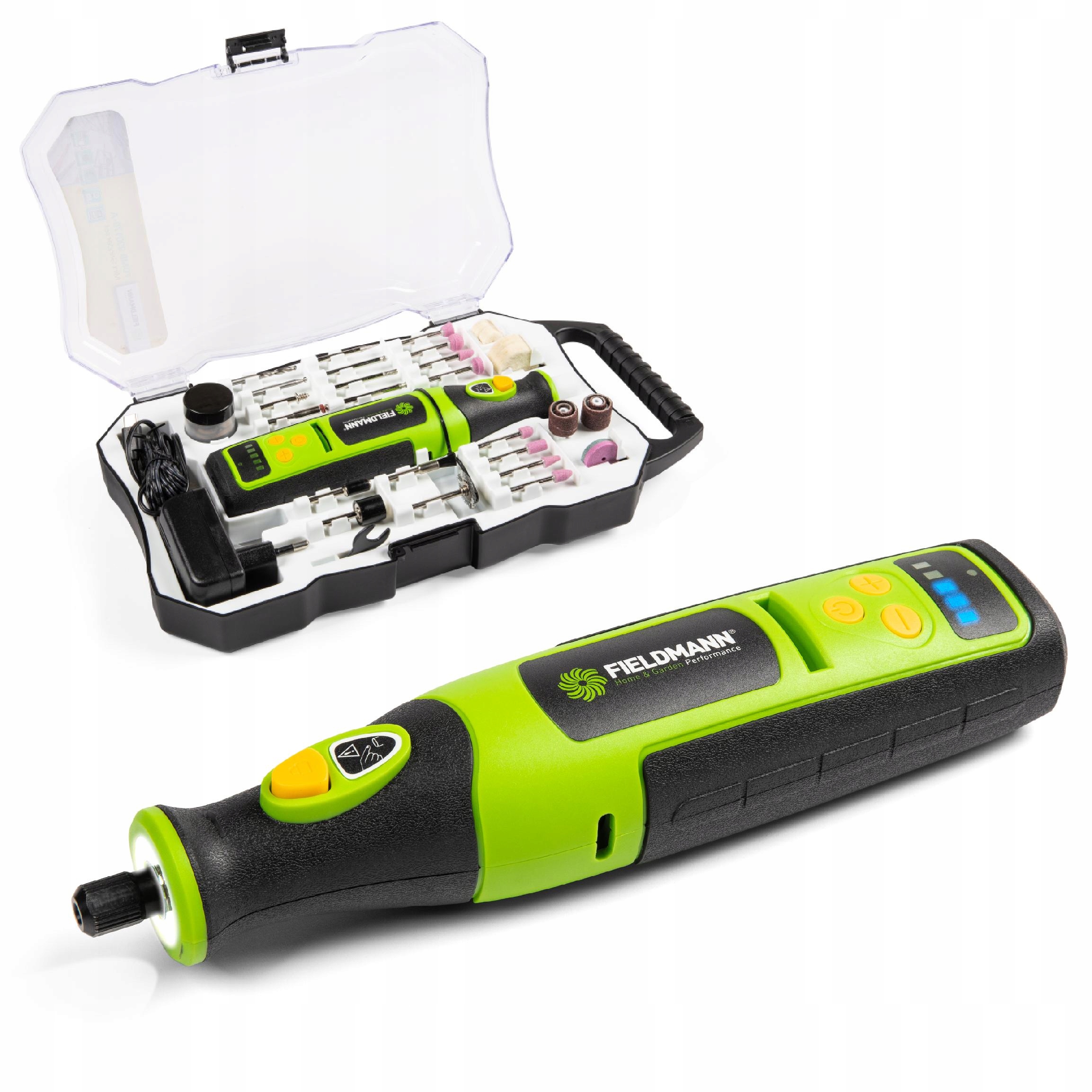 Багатофункціональна акумуляторна ручна шліфувальна машина від надійного виробника Fieldmann, модель FDMB 200170-A. Бездротовий пристрій працює від Li-Ion акумулятора 7,2 В ємністю 1300 мАг, який повністю заряджається за 60 хвилин. П'ятиступеневе регулювання обертів від 5000 до 25000 об/хв. Ергономічна ручка, покрита м'яким матеріалом для кращого захоплення, і світлодіодне підсвічування робочої поверхні. Крім того, набір із 70 найнеобхідніших аксесуарів, які поміщені в практичну валізу.