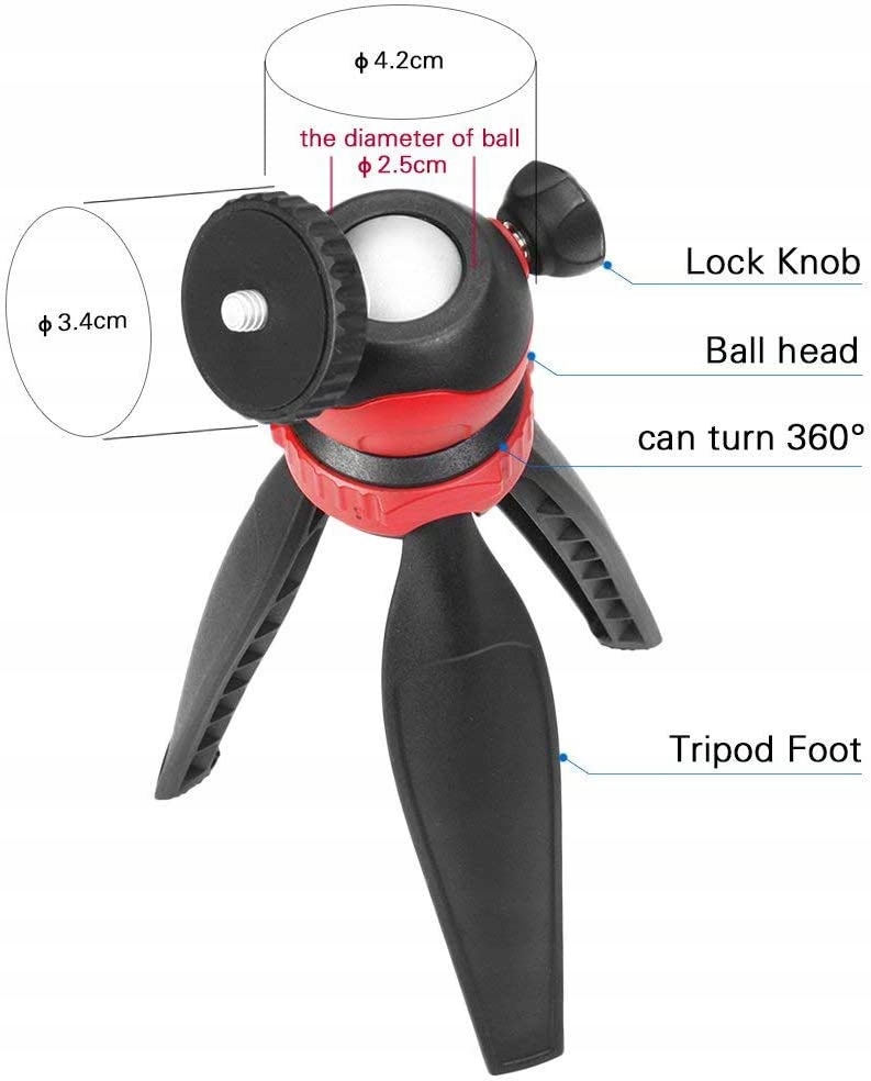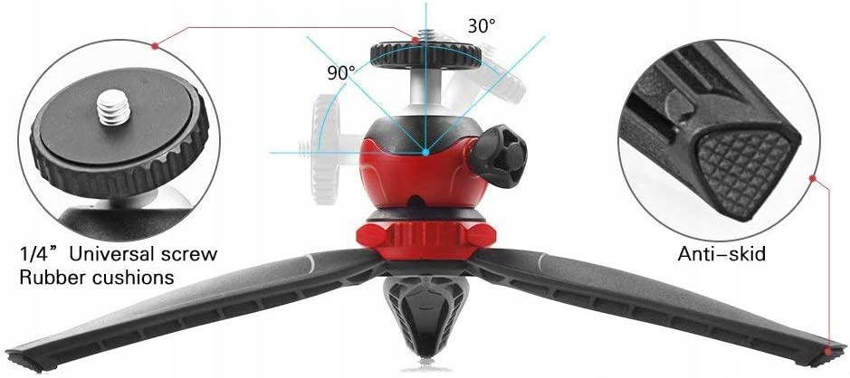 Регульована висота Поверніть швидкознімні ніжки червоного центру, щоб відрегулювати висоту штатива, утримувати його на місці та отримати додаткову опцію мікрофотографії. Цю функцію можна використовувати для настільної зйомки. Це також рішення для зйомки на рівні землі. Особливості Кульова головка, що обертається на 360°, дозволяє робити фотографії в будь-якому напрямку, навіть вертикально вгору та вниз. Його також можна нахилити до 90 для портретної зйомки. Протиковзкий гумовий захист для всіх ніжок штатива для фотоапарата SX 05, обгорнутий гумою для запобігання зсуву та подряпин, що продовжує термін служби та забезпечує якісну зйомку. Застосування Поміщається в будь-який рюкзак, що робить його ідеальним супутником під час подорожей, походів, катання на гірському велосипеді чи скейтборді.