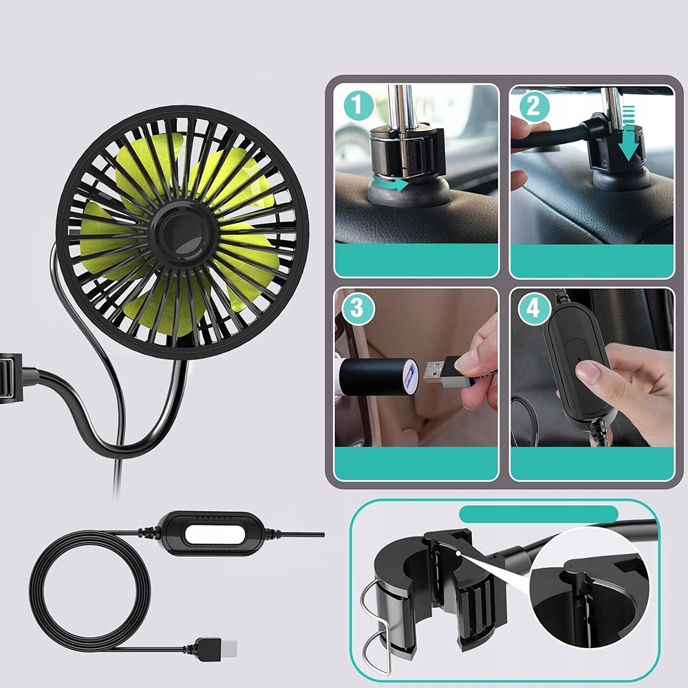 1⃣ Установка в машині: кріпіть вентилятор на задньому сидінні або приладі з вдосконаленим затискачем (підходить до металевих стрижнів діаметром 1-1,55 см). Плоска поверхня для стабільного охолодження.